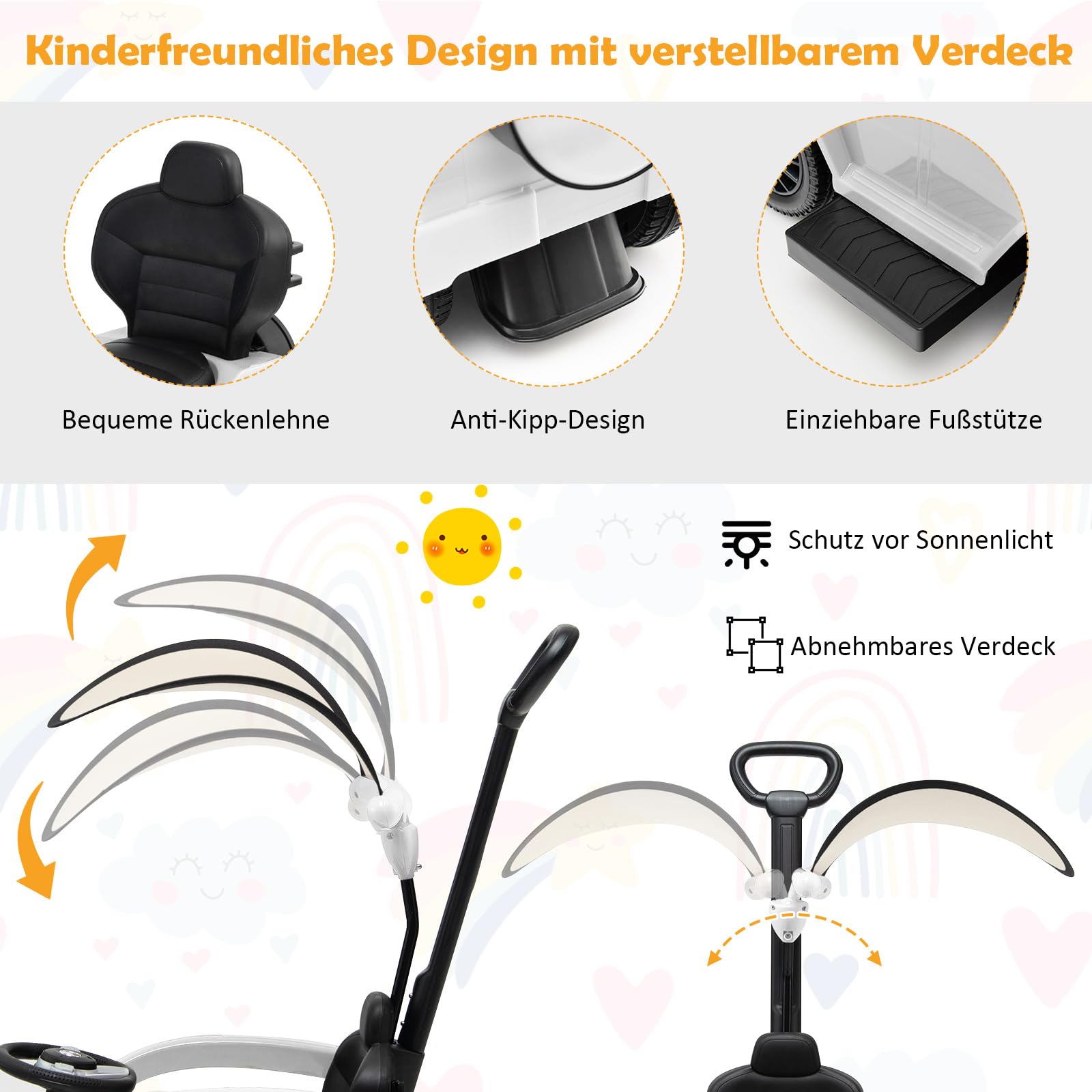 ["【3-in-1 Ride-On Car】Our ride-on car has a convertible appearance with removable parts such as the parent handle, armrest, and sun canopy. You can switch the ride-on car between a stroller with a sun canopy, a ride-on vehicle, and a walker to fit children aged 1 to 3 years.","【Safe and Comfortable Ride】The seat is surrounded by a protective guardrail to ensure that younger children can sit safely. The extendable footrests protect children's feet from the wheels and also provide a comfortable platform to relax their feet.","【Licensed for Realistic Driving】The appearance of this push car is officially licensed from Mercedes Benz G350. And the steering wheel is actually functional, allowing the children to steer the toy car left and right, providing them with the experience of realistic driving.","【Stimulating Sounds】The buttons on the steering wheel play engine sounds (right button) and horn (left button) to grab the children's attention and make driving even more entertaining. To produce sounds, you need to insert 1.5V AA batteries x 2 (not included) into the battery slot next to the buttons.","【Convenient Sun Canopy & Hidden Storage】Equipped with a 360-degree adjustable sun canopy, the push car with handle provides shade from sunlight. Additionally, there is a hidden storage space under the seat where children can store small items they find on their journey."]