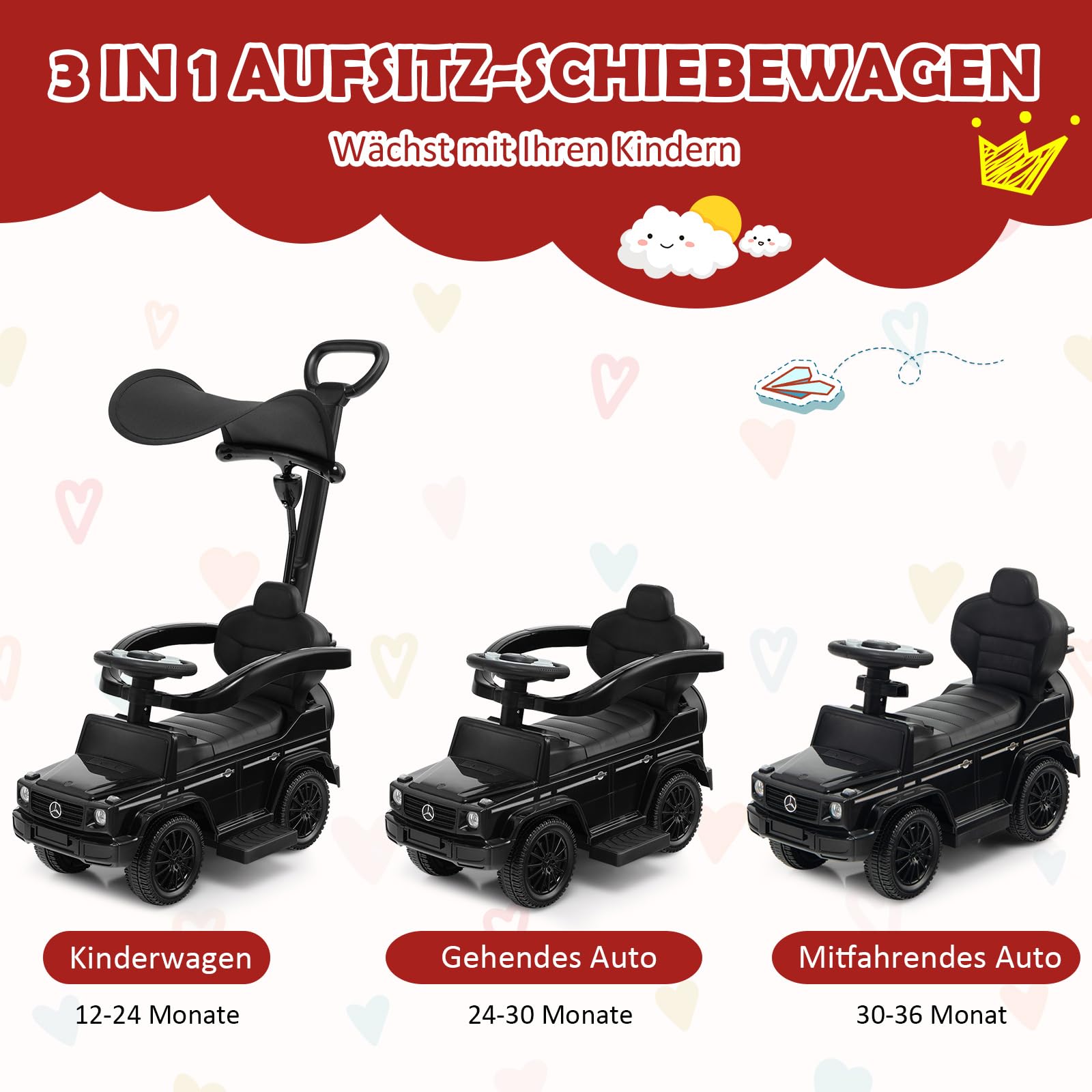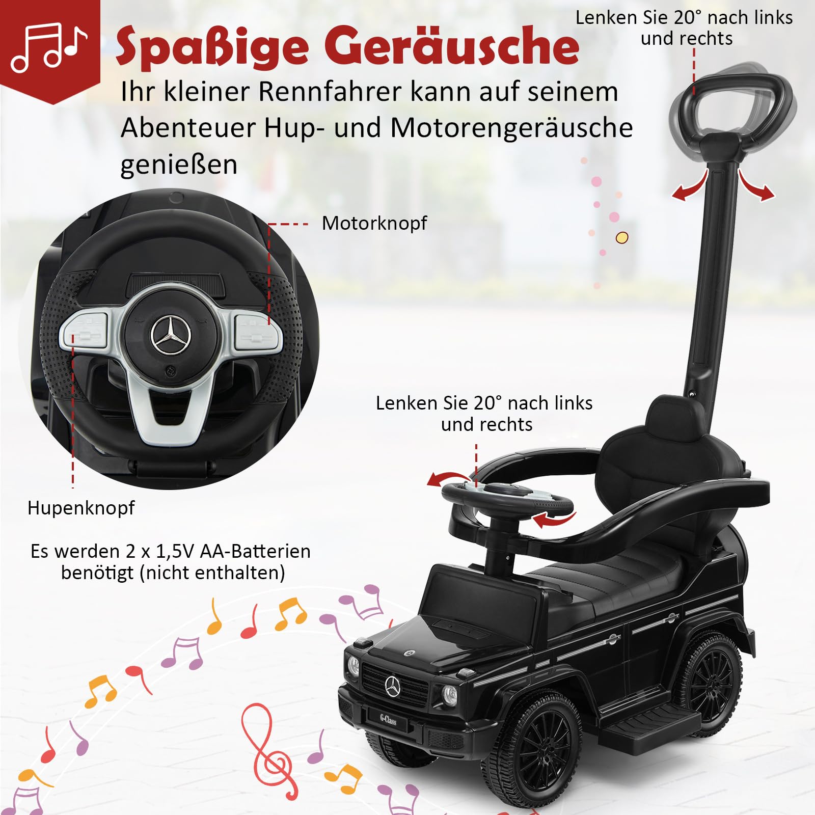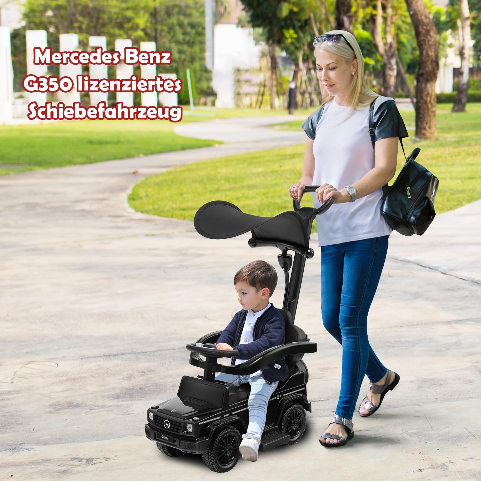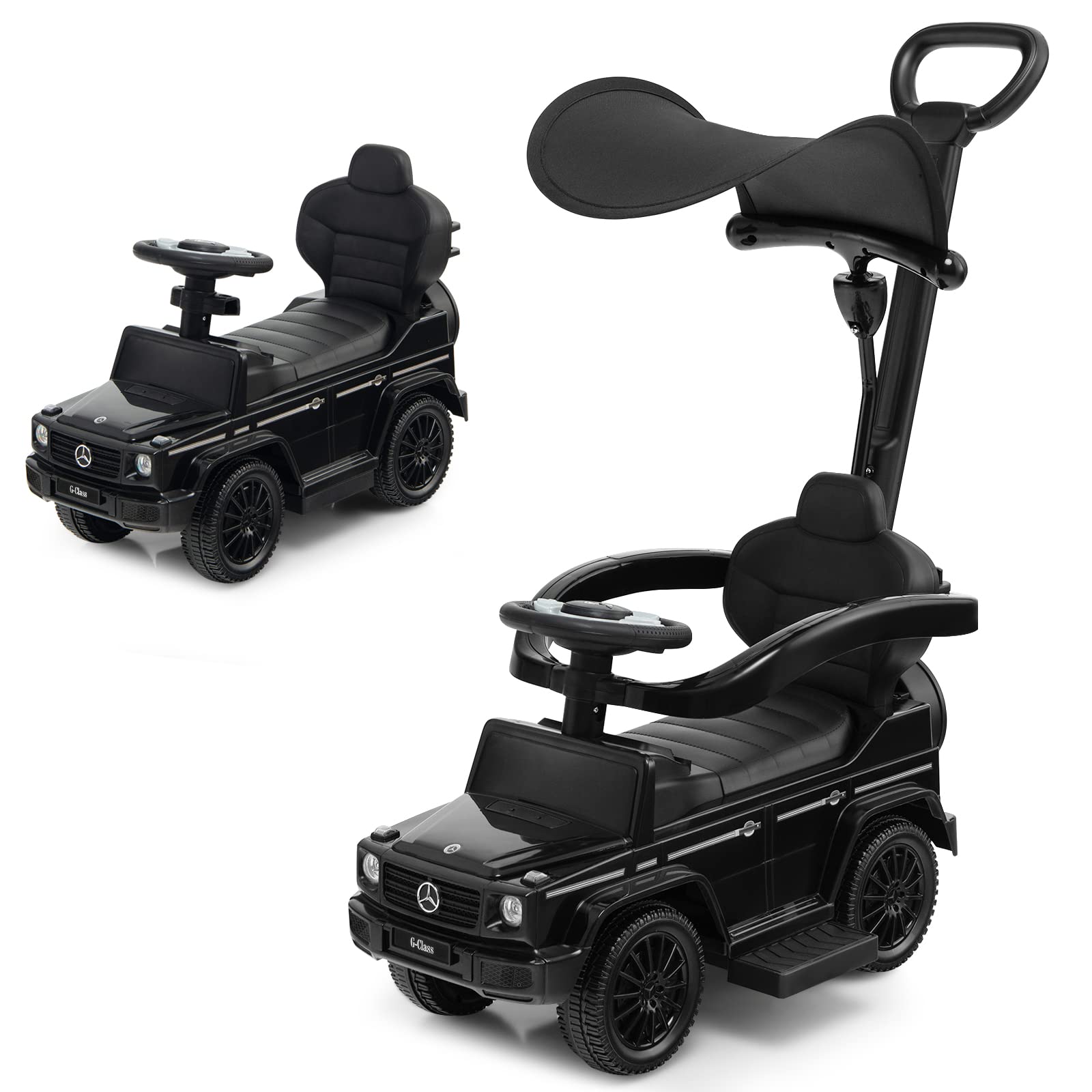 ["【3-in-1 Ride-on Car】Our ride-on car has a convertible design with removable parts like the parent handle, armrest, and sun canopy. You can switch the ride-on car between a stroller with sun canopy, a push car for riding, and a walker to fit children aged 1 to 3 years old.","【Safe and Comfortable Ride】The seat is surrounded by a protective rail to ensure that younger children can sit safely. The extendable footrests protect children's feet from the wheels and also provide a comfortable platform to relax their feet.","【Licensed for Realistic Driving】The appearance of this push car is officially licensed by Mercedes Benz G350. And the steering wheel is actually functional to steer the toy car right and left, giving children the experience of realistic driving.","【Stimulating Sounds】The buttons on the steering wheel play engine noises (right button) and horn (left button) to grab children's attention and make driving even more fun. To produce sounds, you need to insert 1.5V AA batteries x 2 (not included) into the battery slot next to the buttons.","【Convenient Sun Canopy & Hidden Storage】Equipped with a 360-degree adjustable sun canopy, the push car with handle provides shade from sunlight. Additionally, there is a hidden storage space under the seat where children can store small items they find on their journey."]