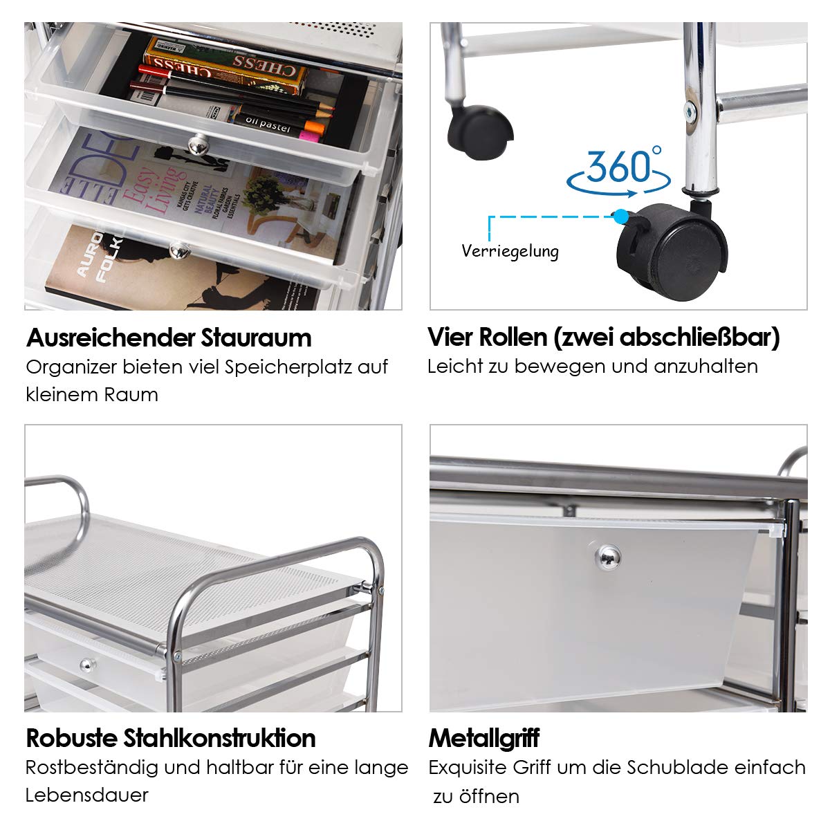 ["【Long Service Life】The trolley is made of iron and PP material, which is resistant to damage. It has a stable structure and a long service life. Load capacity of the top shelf: 22 lbs. Weight capacity of the large drawer: 6.6 lbs. Load capacity of the small drawer: 4.4 lbs.","【Removable Drawers】The mobile storage cart has 15 separate drawers, each of which can be removed; the drawers in the rolling cart can be easily opened with a fine button.","【High Maneuverability】The rolling cart has 360° rotating casters for easy movement; two of them are equipped with locking brakes, ensuring strong stability.","【Wide Range of Uses】The bathroom trolley has 5 large drawers and 10 small drawers, making it versatile for use in the study, office, bathroom, or children's room, suitable for cosmetics, brushes, combs, towels, or toys, etc.","【Modern Design】The clear modern design impresses with functionality and convenience in handling. With clear instructions, it is also easy to assemble."]