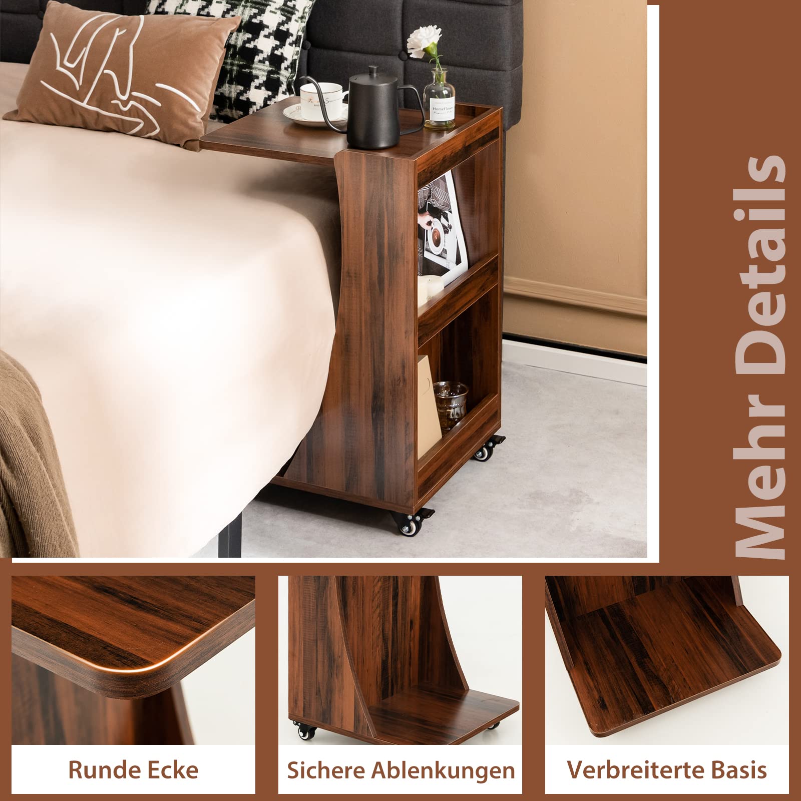 COSTWAY side table with wheels, mobile sofa table with 2 rear storage shelves, C-shape, coffee table for living room, bedroom, 42.5 x 38 x 67 cm, vintage brown.