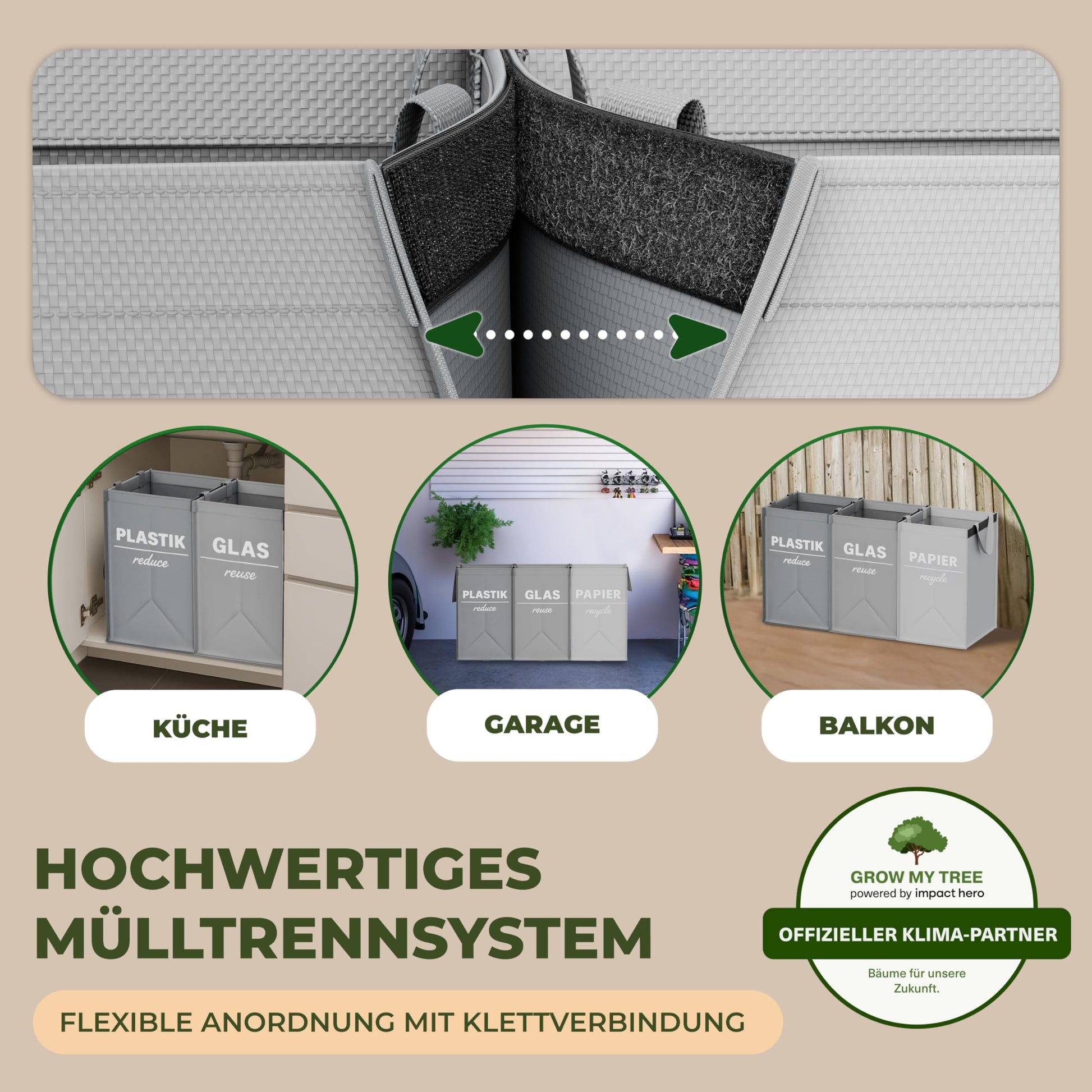 ["Strong Materials - The waste separation bags are made of double-layered polypropylene. The edges are reinforced with fabric, making them much more tear-resistant than regular trash collectors. The handles are reinforced with X-stitches and comfortable to carry","4 x STABILIZERS - The waste bins stand stable in any condition. The stabilizers help maintain the square shape. The trash bins can be connected with velcro","EASY CLEANING - The waste separation system is waterproof and easy to clean. The material is odor-resistant and perfect for collecting old paper, glass, cans, deposits, or empties","PERFECT SIZE - The separation system has a volume of approx. 120L. This provides enough space for all household waste. The waste separation system fits well in the kitchen, pantry, or camping","100% CUSTOMER SATISFACTION - As a German brand manufacturer, our support team is always available to you. Thousands of customers are already satisfied with our waste separation and storage products"]