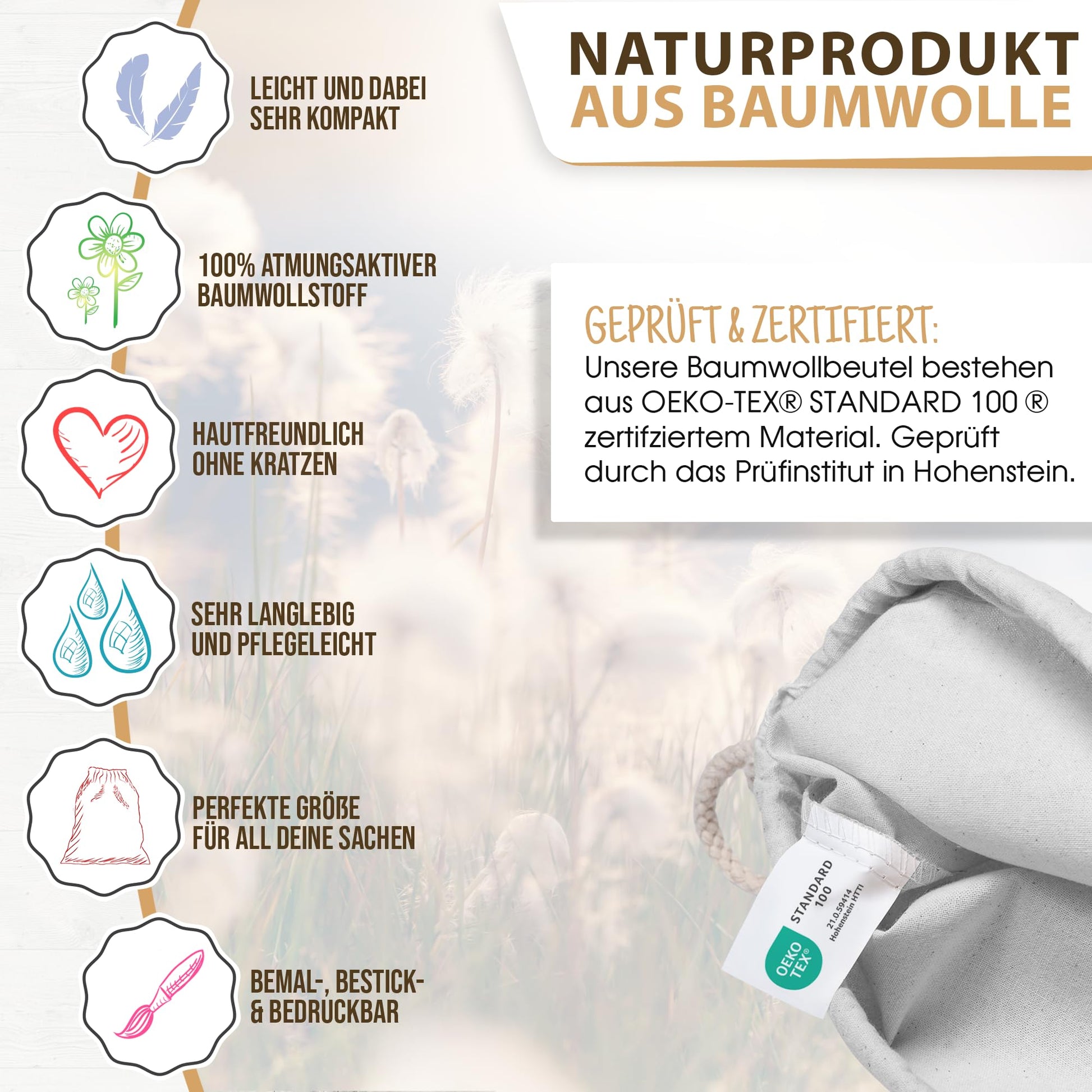 ["HIGH QUALITY & ECO-FRIENDLY: Thick GRAMMAGE OF 140 g/m² instead of the usual 100 g/m², these gym bags are almost 40% stronger and more durable. The OEKO-TEX certified cotton, as well as the overlocked inner seams, ensure stability and optimal protection for your favorite items.","MAXIMUM COMFORT COMBINED WITH SAFETY: Instead of traditional, often prone to rust metal eyelets, this gym bag offers better comfort and additional safety with weather-resistant side loops and cotton drawstring cord.","INDIVIDUAL, CREATIVE - UNIQUE: Our cotton bags are perfect for printing, stamping, painting or even professional screen printing. Whether with your own designs, series of images, or children's drawings, a unique look is guaranteed, offering plenty of room for personal ideas.","TIMELESS AND MODERN DESIGN: Whether as an alternative to a bag, a companion for a workout, or for your shopping errands, this bag is super versatile for any occasion. The white color makes the bag a timeless eye-catcher and can be perfectly combined with other colors.","25 YEARS OF EXPERIENCE AND BRAND QUALITY: If our cotton bags do not meet your expectations, you will of course receive your money back. Constant quality controls during production with over 25 YEARS OF EXPERIENCE allow us to pass on this promise to you.","MATERIAL: 100% Cotton"]