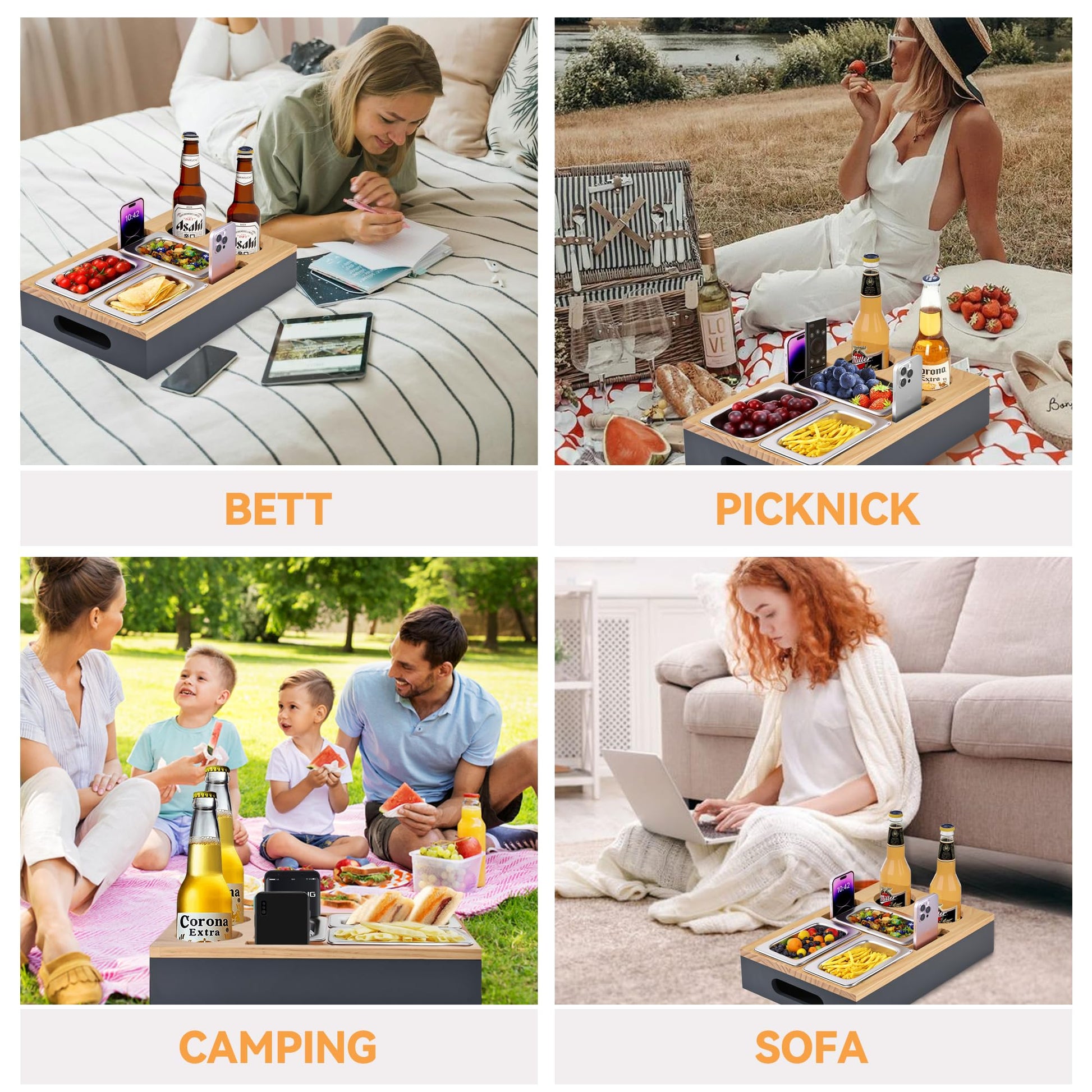 Couch bar snack box, coffee bar with stainless steel snack bowls, bamboo black couch tray, sofa shelf - for bedroom, living room, camping, garden (wood-gray)