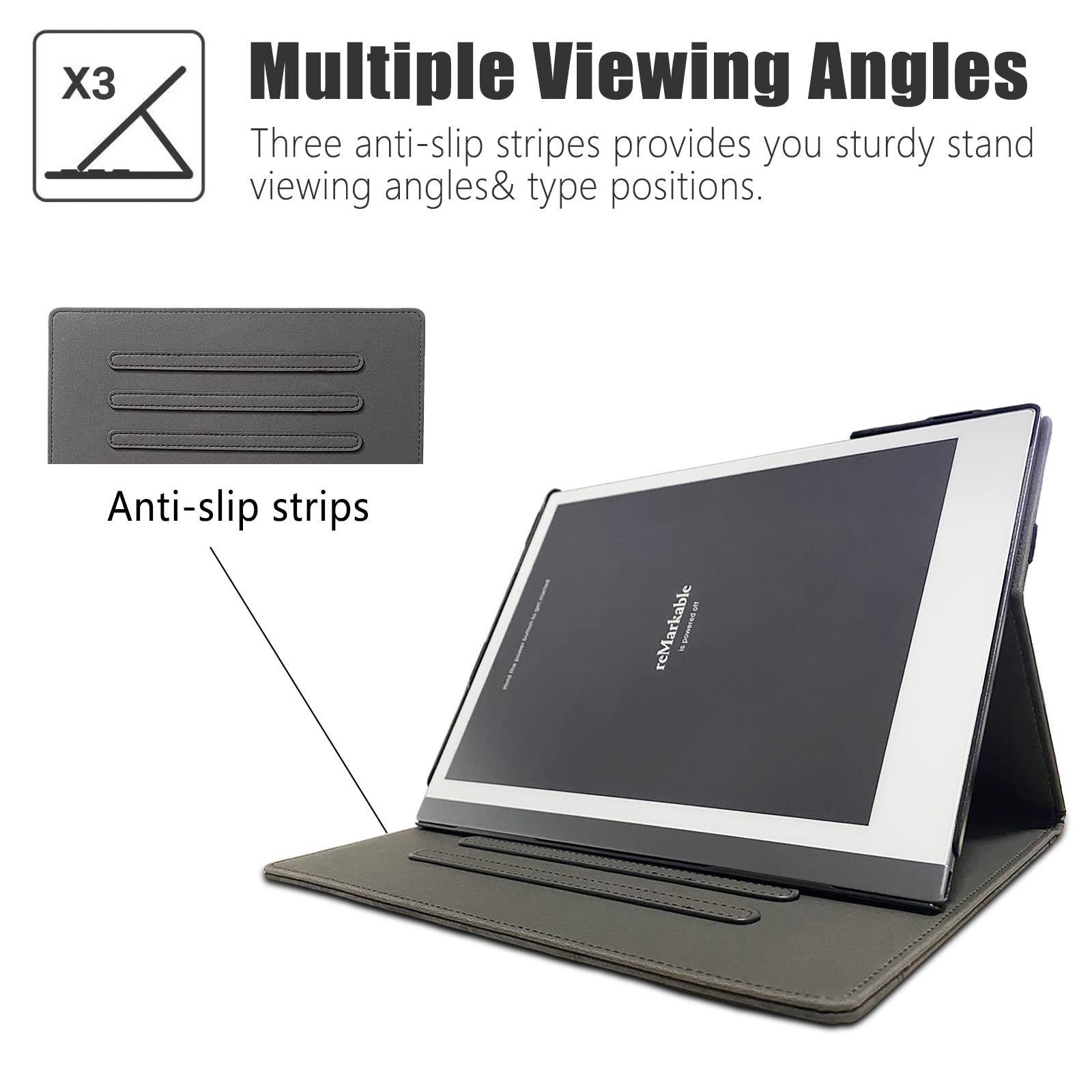 ["【PERFECT COMPATIBILITY】The slim, lightweight book case is specially designed for the reMarkable 2 10.3 inch (2020 released). Easy access to all functions and control buttons. Note: It will NOT work for reMarkable 1. Please check the model number before purchasing.", "【UNIQUE DESIGN】Hand strap makes reMarkable 2 paper tablet 10.3 inch case easy to carry and allows you to hold the tablet with one hand. You don't have to worry about the tablet falling while reading. Strong elastic band securely fasten the front cover either open or closed.", "【Adjustable Angles】This reMarkable 2 case 2020 allows you to securely adjust the tablet in multiple angles to create a stand for reading, viewing, typing, freeing your hands for other conversations.", "【Multifunctional Storage】Design with a smart pen holder to protect and store your reMarkable Marker. Keep it always ready for you. On the surface of the reMarkable 2 case, you can store your cards, sticky notes, and other paper. (reMarkable Marker is NOT included).", "【DESIGNED FOR FULL PROTECTION】Made of premium PU leather outer and soft microfiber inner holder effectively protect your reMarkable 2 digital paper tablet from unwanted scratches, scuffs, and other hard objects. Pen holder can securely hold your reMarkable Marker in place so it doesn't fall out while walking. (Pen is NOT included)"]
