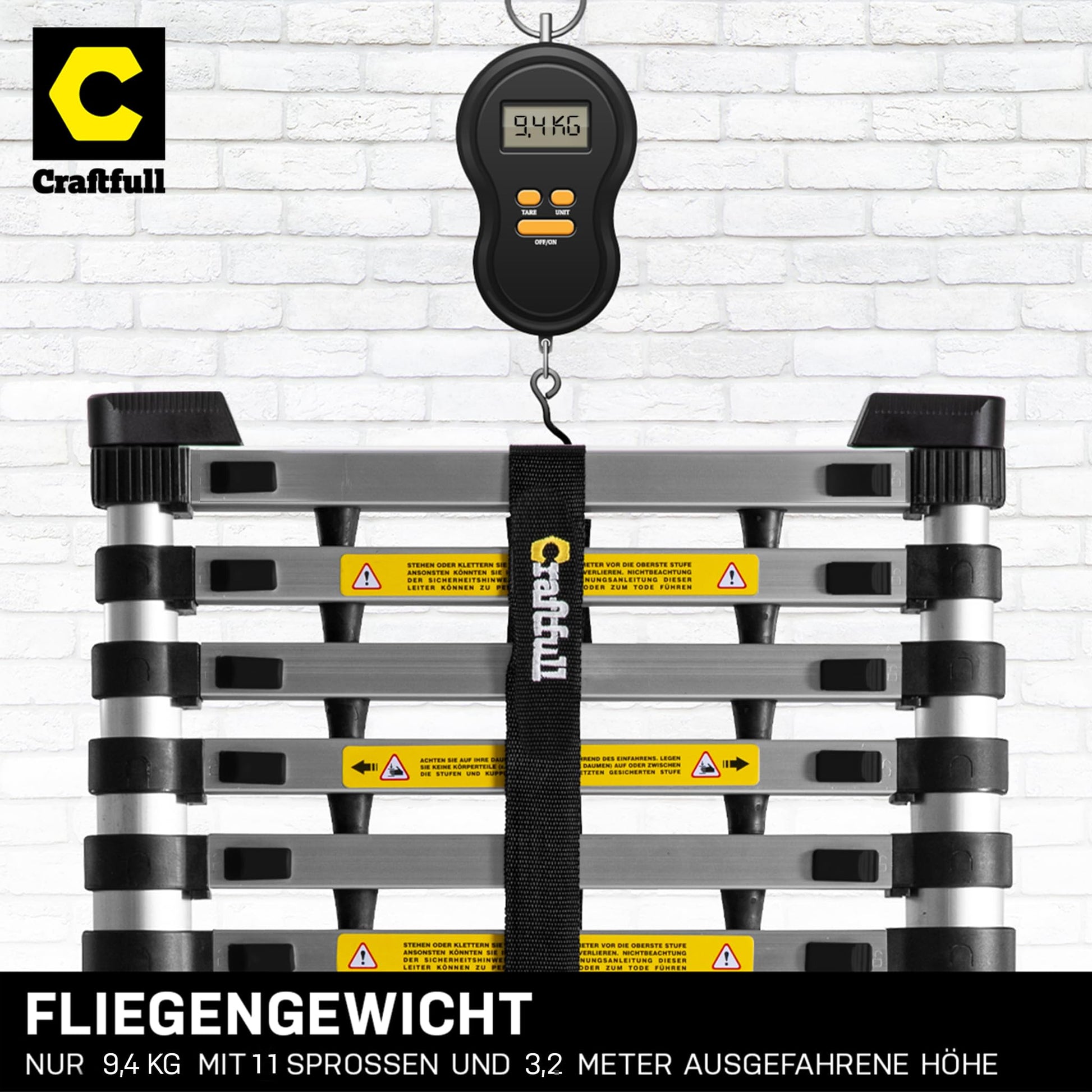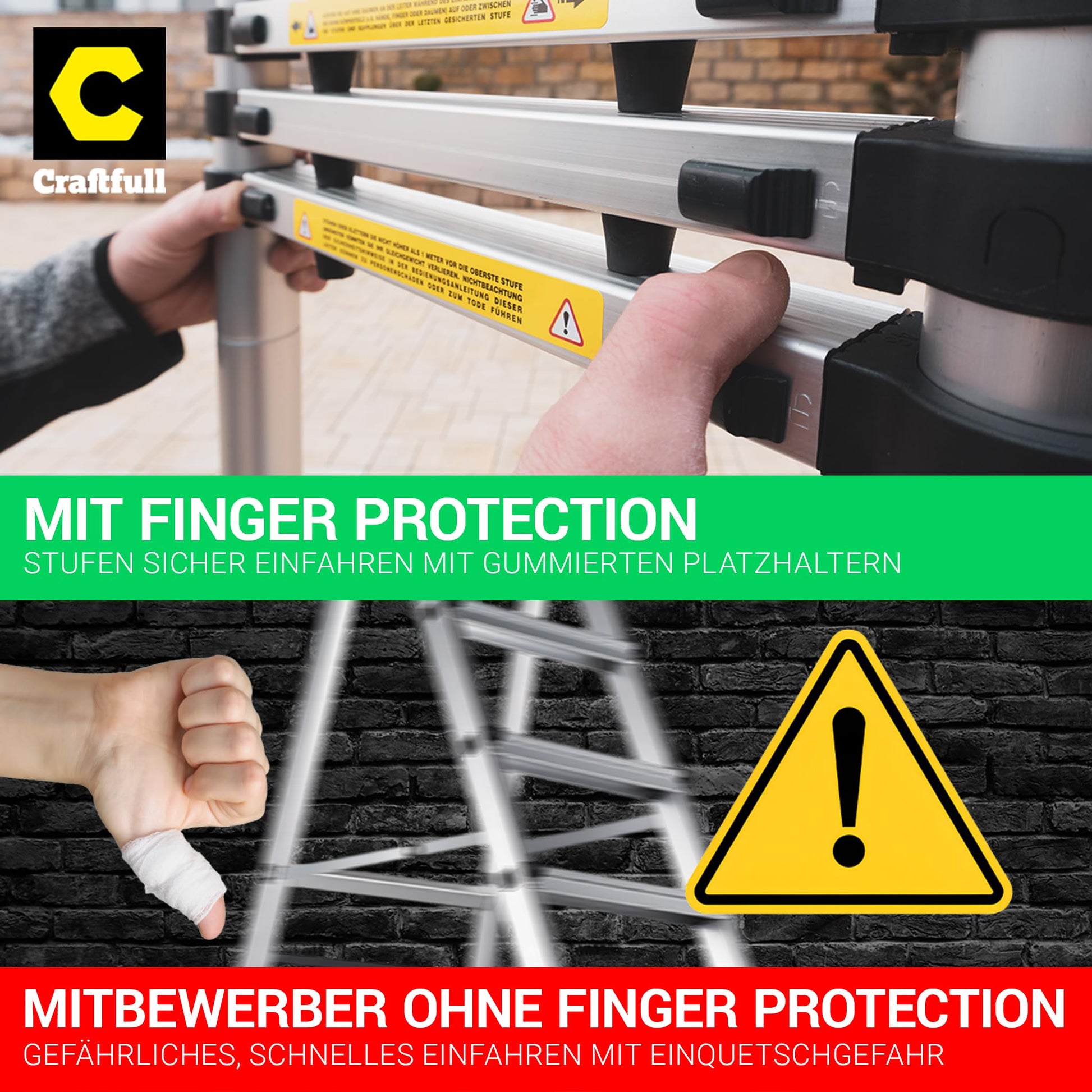 "Maximum Security π Integrated Finger Protection System, reliable safety locking mechanisms and anti-slip feet prevent crushing & slipping accidents. The sturdy crossbar from 10 feet guarantees extra stability - for safe working in any position and height.""Robust & reliable ποΈ Made of high-quality aluminum, the ladder carries up to 330 lbs and provides high stability - it is rustproof, weatherproof, and easy to transport.""Optimal versatility π Available in 7 sizes from 6.6 ft to 14.4 ft, with up to 15 rungs and a working height up to 17.58 ft - ideal for painting, gutter cleaning, or use in workshops and households.""Compact & practical π Space-saving foldable and easy to transport. The included Craftfull carrying bag protects the ladder and facilitates transportation - perfect for quick on-site use.""Comfortable & stable π¦Ά 35 cm wide rungs with 28 cm spacing provide a secure footing and comfortable working - even during longer tasks at great heights - flexible for DIY enthusiasts, tradesmen, and professionals in renovations, construction work, or garden projects."