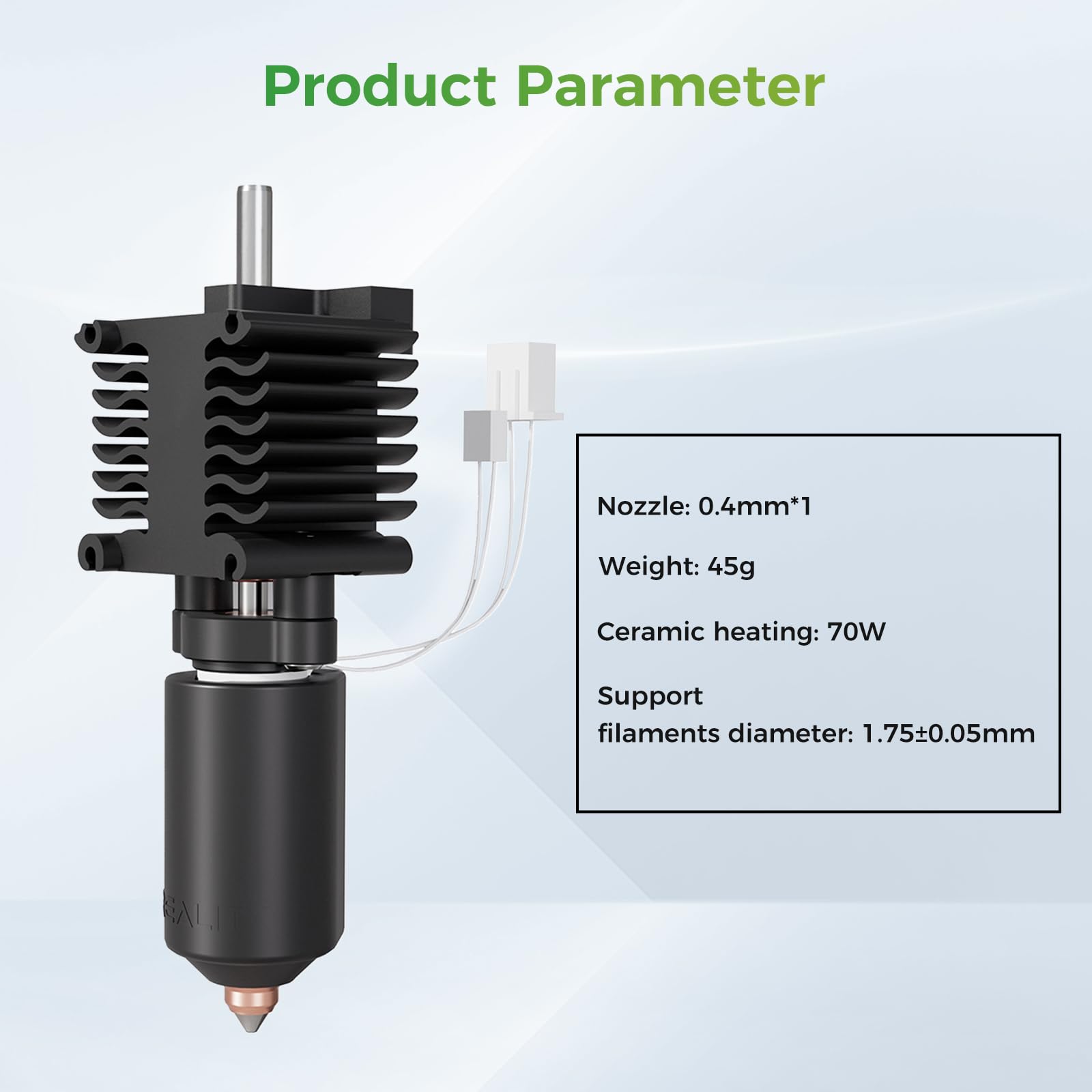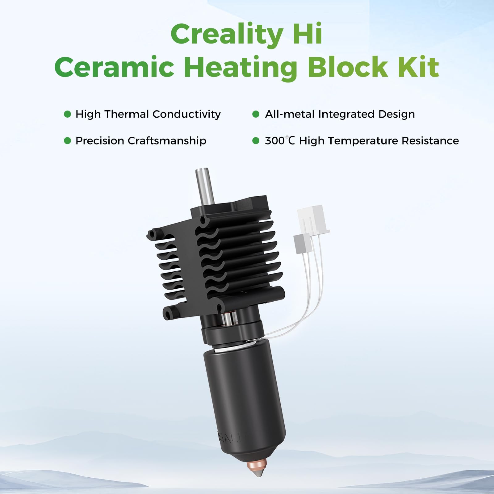 ["Ceramic heating block kit for Creality Hi Combo / Creality Hi. Unicorn nozzle and heat break feature an integrated all-metal design for quick disassembly and convenient swapping","Even heating: The 360° ceramic heating improves heat efficiency, ensures more uniform heating and faster heat transfer","Master of Materials: Creality Hi heating block can reach temperatures up to 300°C. Designed for use with wear-resistant technical materials with high melting points, such as PLA, ABS, PETG, TPU, PP, PC, PLA-CF, PA-CF, PET-CF, etc","No clogging, no leakage: Smooth inner wall of Creality Hi Ceramic Hotend, smooth feeding. No burrs at the nozzle, stable pressure and not easy to clog. Joints are tightly fitted to effectively prevent pressure leakage","Customer service: We offer professional after-sales support, more than 20 engineers provide customer service 24 hours/7 days, please contact us directly (seller) via \"ask a question\""]