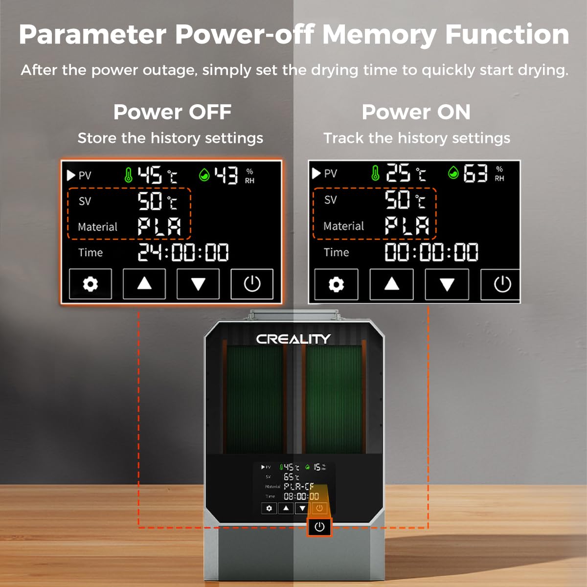 "【Parameter Shutdown Memory Function】🟠 --- After a power outage, the machine can restart and still remember your previous material and temperature settings. Eliminating the need to re-set up and allowing for quick drying.",