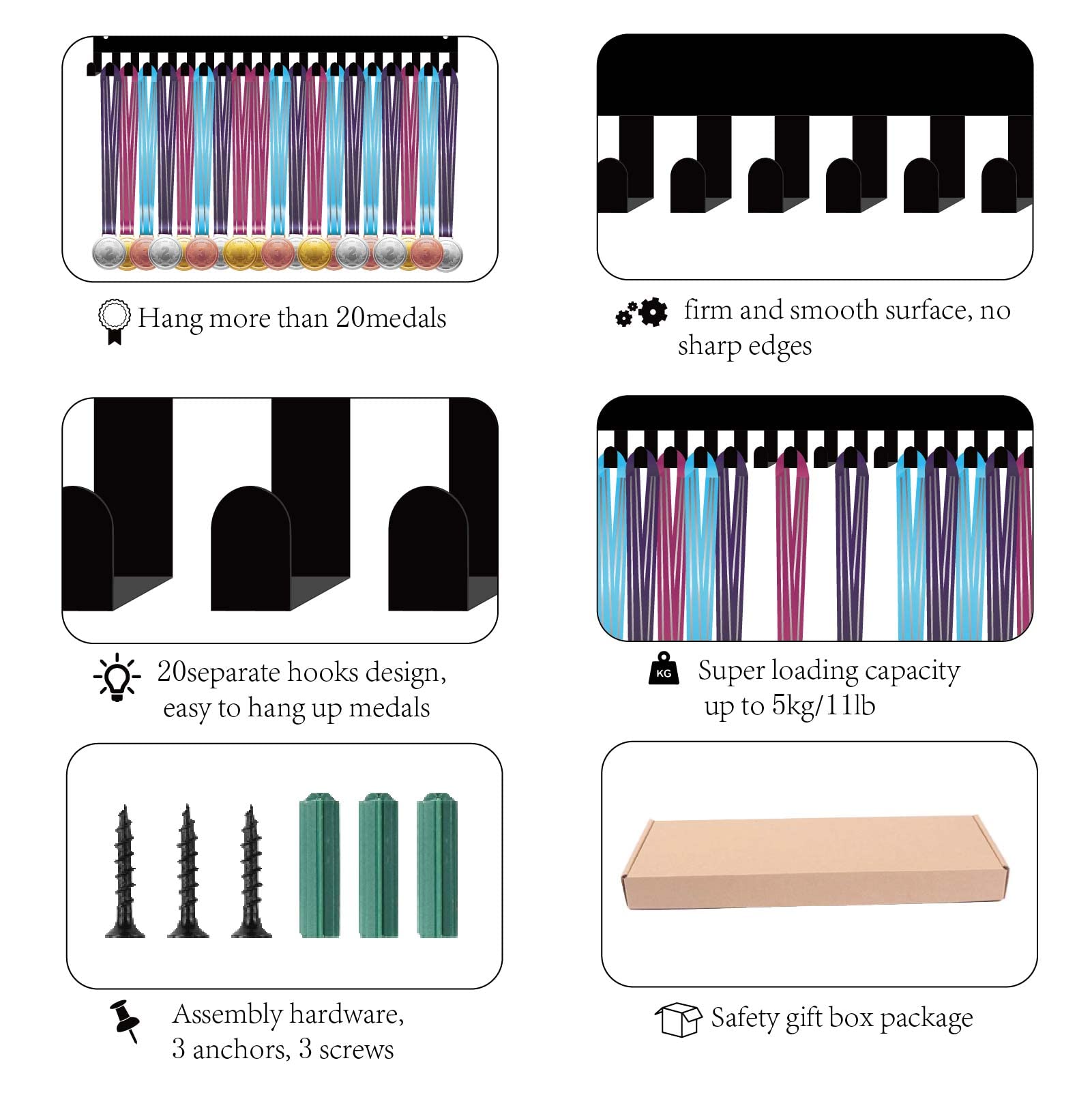 "HOLDS OVER 60 MEDALS: The medal display rack is made of high-quality iron, with 20 hooks, and can hold up to 5kg/11lbs, fully meeting your medal needs. Contains no formaldehyde, carcinogens, or pollutants, not easily rusted. Great storage for messy medals, perfect decoration for hanging in the room.",