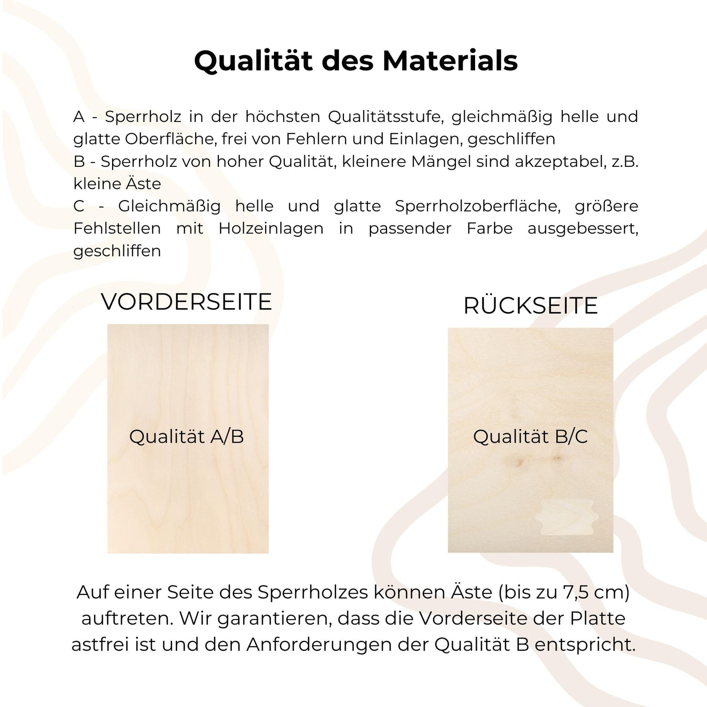 ["HIGH QUALITY - each wooden board measures 300 mm x 210 mm x 3 mm - approximately the size of A4 paper. Length and width with +/-2 mm tolerance.","BIRCH PLYWOOD B/B - Our boards have a smooth, sanded surface guaranteeing at least one flawless side. The back side may have more repaired defects up to 6cm in size. In some cases, the front side may meet class A quality standards instead of B, while the back side may meet class C instead of B. All plywood boards are carefully inspected by hand to minimize defects and ensure the highest quality.","PRECISE CUT - rounded, treated edges, safe for all ages to use! Perfect plywood boards for staining, painting, staining, crafting, pyrography, DIY projects, decoupage, wood burning, laser cutting, engraving, scroll sawing, canvas, screen printing board, timber. Crafting and other decorative projects or personalization. Widely used in furniture making, such as cabinets, shelves, tables, chairs, and in the substructure of upholstered furniture.","RARELY DEFORMS - If it happens to deform, moisten the concave side and dry the convex, bulging side. Use a sponge or syringe to moisten the concave side of the plywood (hot water). Then place the board with the moist side down on the floor for 2 days. Alternative to chipboard, MDF, poplar plywood, veneer wood, scroll saw wood, OSB boards, craft wood, particle boards, cover boards, balsa wood, cabinet back panels.","MADE IN THE USA - Our craft wood boards are made from natural and non-toxic materials. Therefore, we are confident that our products, made in the USA, have the highest quality on the market. Plywood has a wide range of applications as a building material for exterior walls, roof sheathing, and formwork in rough construction, as well as for wall and ceiling cladding, doors, and as a substrate for wooden floors in finishing."]