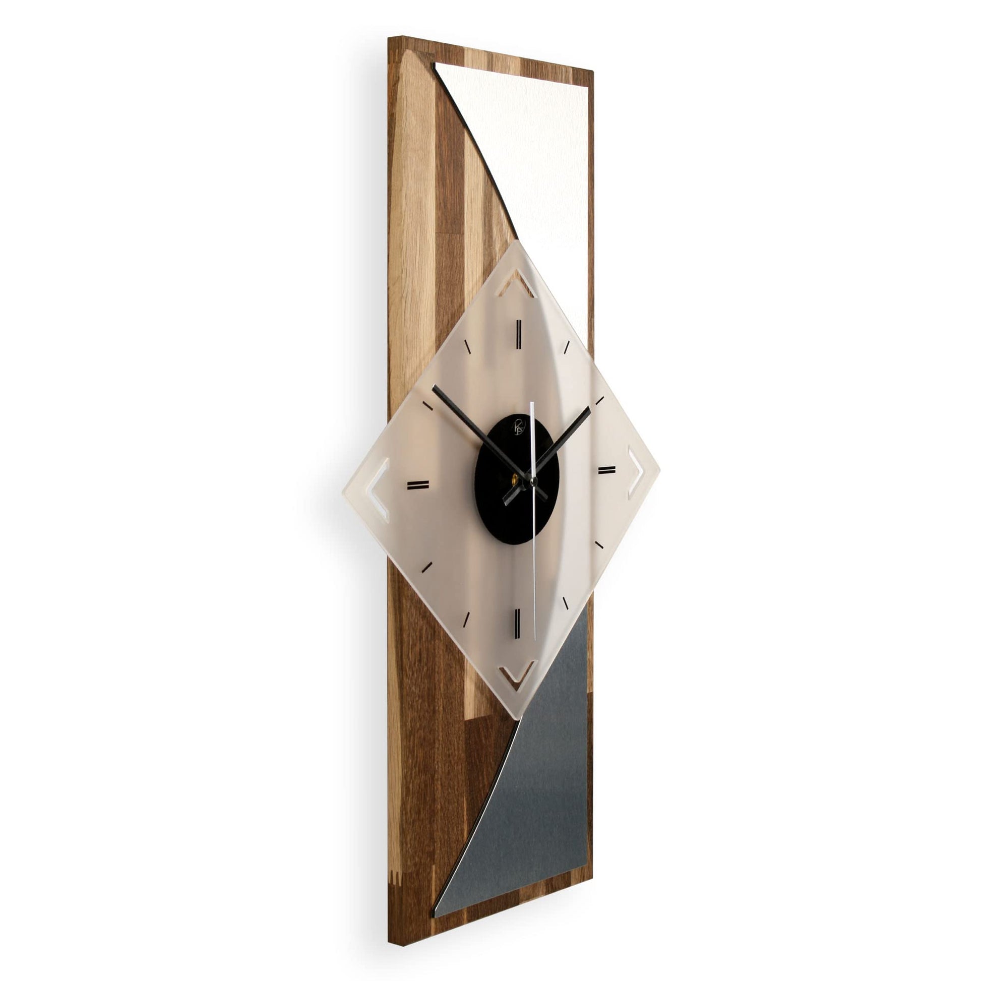 ["Luxury DESIGN CLOCK made of natural smoked oak wood | metallic shiny surface of brushed aluminum composite | acrylic glass dial | hands made of brushed aluminum | Size max. 27.6 x 13.2 inches","ANALOG REAL WOOD CLOCK from the Thuringian Vogtland | abstract 3D design | individual character | handmade | color & grain vary according to natural material properties","FLOATING LOOK due to invisible wall mounting | easy to install | ready to hang | including wall mount & mounting material (plugs & screws)","WHISPER-QUIET MOVEMENT either radio-controlled or quartz movement | creeping second hand | silent | no ticking | for a peaceful environment | perfect for any room, for bedroom, children's room, study","SPECIAL EYE-CATCHER for living room, kitchen, dining room, office, practice, café, bar, hallway | GIFT IDEA for birthday, wedding, Christmas, Easter, move-in, anniversary"]