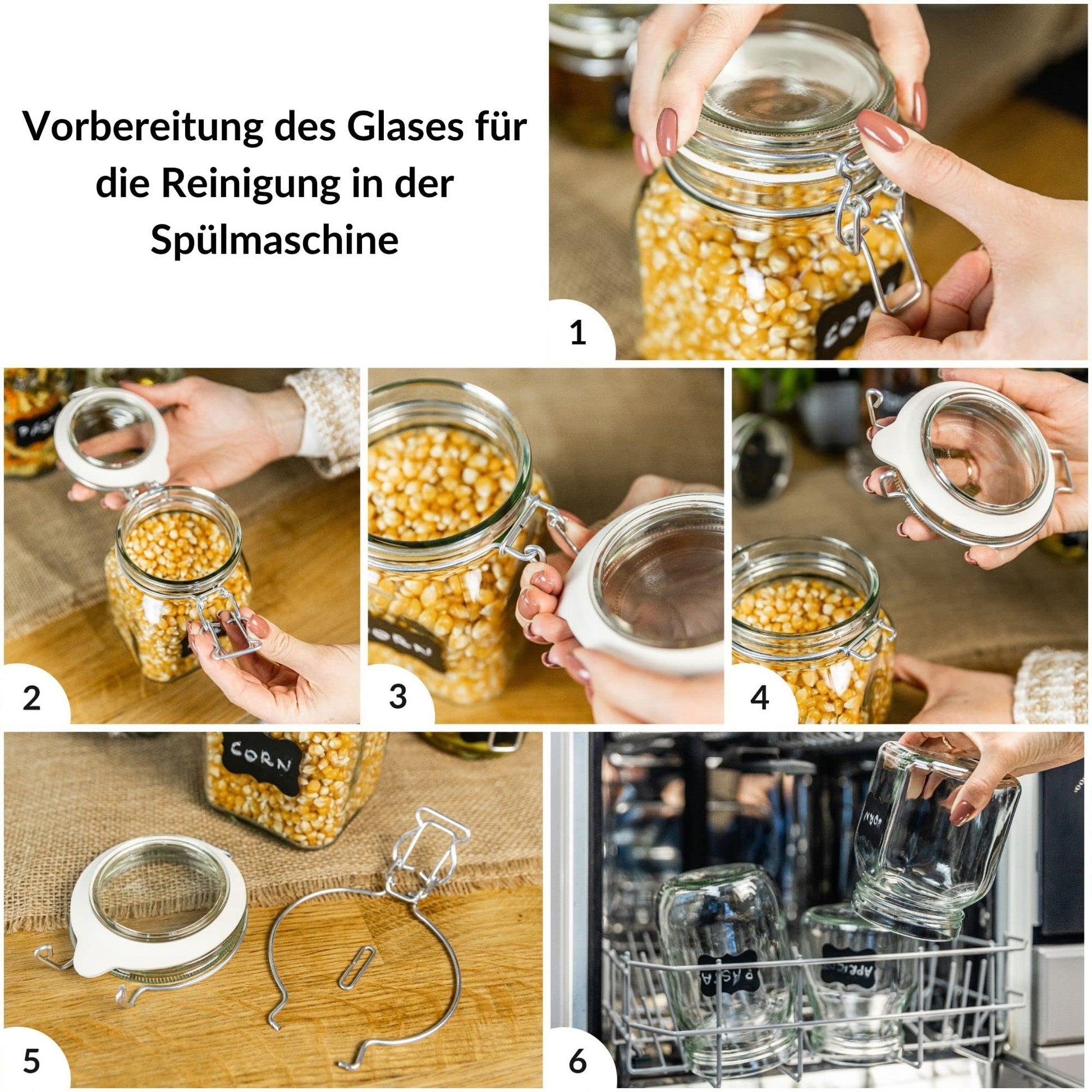 ["8 CLIP-TOP JARS - Our glass clip-top jars are airtight thanks to the special silicone seal, ensuring no air enters or leaves the jar; our storage jars help preserve the freshness, taste, and aroma of your food. Paired with reusable self-adhesive labels and chalk, these disposable jars make an attractive accessory for your kitchen.","VERSATILE STORAGE JAR - Our wire clip jars are perfect for storing cookies, pasta, sugar, cinnamon, herbs, spices, pickles, honey, seeds, tea, jam, flour, and many other foods. Also great as a coffee canister, candy jar, spice jar for both shelf and fridge storage, a Weck jar for gifting preserves, or a wire clip jar for storing non-food items like coins, small trinkets, toys, or cotton swabs.","DURABLE GLASS & AIRTIGHT CLIP-TOP - European-certified storage glass combined with a sturdy, perfectly fitting wire clip ensures easy, repeated opening and closing of the jar and a long lifespan. Our clip-top jars can also be used as jam jars, fermenting jars, spice jars, Weck jars, storage containers, preserving jars, dessert jars, overnight oats jars, or canning jars.","MADE IN THE EU - We source our lidded jars from a renowned European glass manufacturer specializing in beautiful glassware for the home. Our product combines traditional craftsmanship with modern design to create an eye-catching 750ml jar for your kitchen, table, and home.","GUARANTEE - While we pack our storage jars as safely and carefully as possible, there may be instances where the glass containers arrive broken or damaged due to factors beyond our control. Please contact us immediately - we will surely find a solution."]