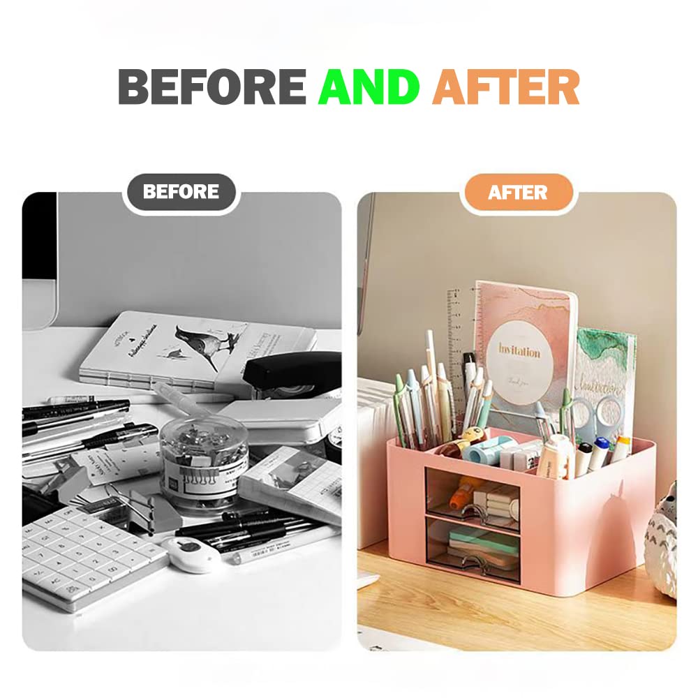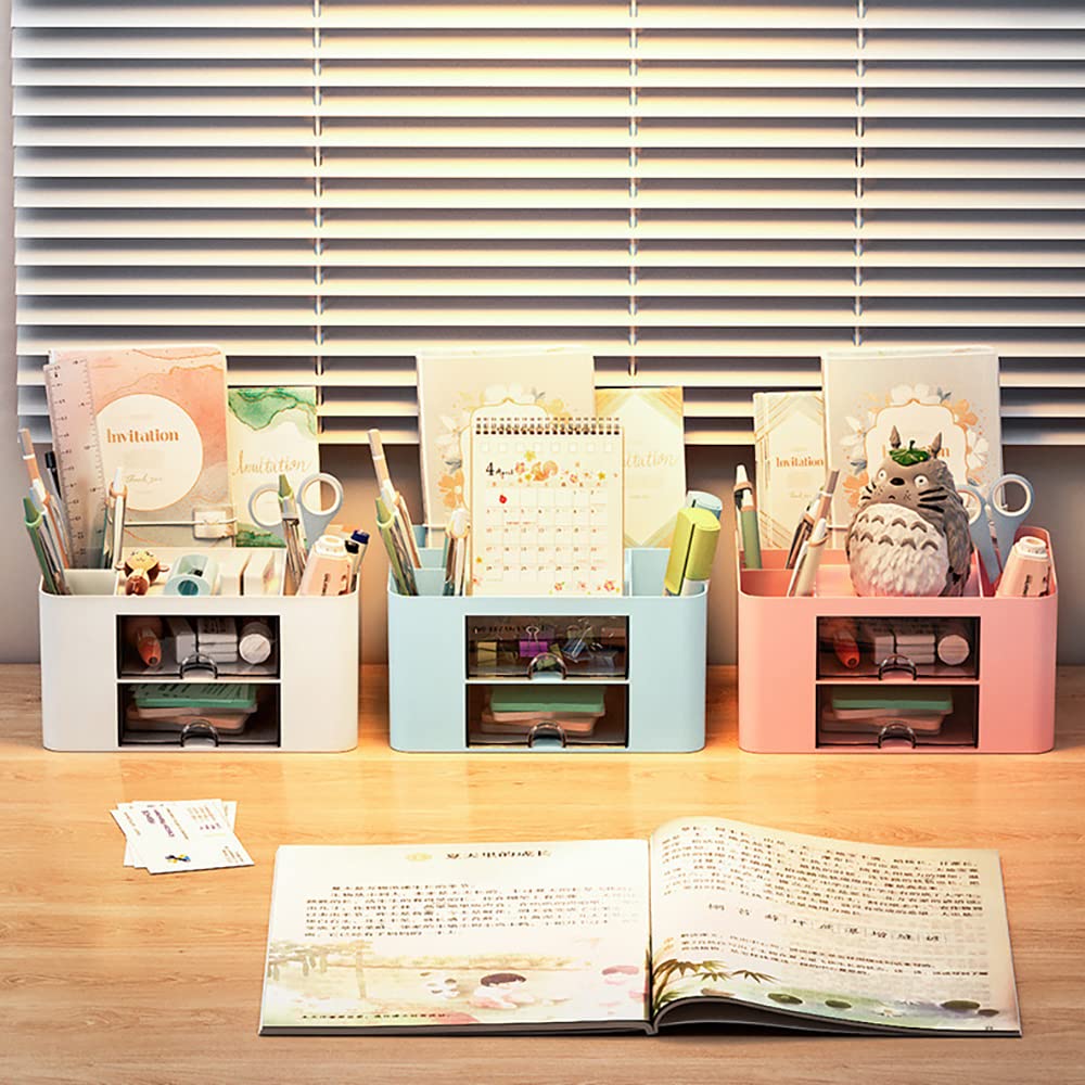 ["✍【High-Quality Materials】The desk organizer is made of high-quality plastic, with smooth, burr-free edges, 5 compartments with transparent drawers, easy access to items, and reusable.","✍【Practical Combination】The desk storage box has 5 compartments and 2 transparent drawers. You can sort and store everyday items such as pens, pencils, staplers, scissors, rulers, glue sticks, file holders, notes, push pins, and pens. The ideal desk organizer makes your space cleaner and tidier.","✍【Thoughtful, Protective Design】This table organizer has a smooth surface with rounded corners for a comfortable feel and prevents hand injuries when picking up/removing items, and the transparent drawer allows you to quickly and easily find all the small items in the organizer.","✍【Multifunctional Storage Box】The desk organizer is available in pink, white, and blue. This organizer can store pens, office supplies, brushes, remote controls, and cutlery, ideal for children, offices, and families. It is a gift for students, teachers, and office workers.","✍【Satisfactory Service】If for any reason you are not 100% satisfied with our products, please do not hesitate to contact us, we will provide you with professional customer service from our customer service team and try our best to help you solve the problems. Your satisfaction is always very important to us."]