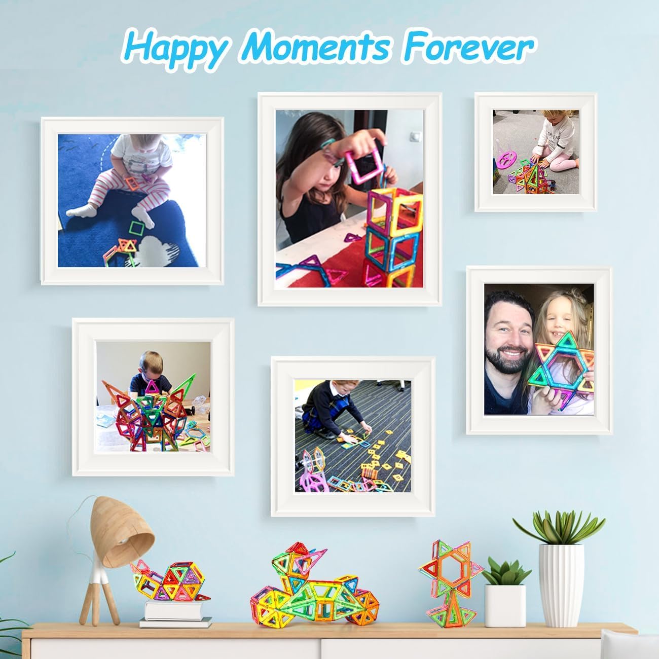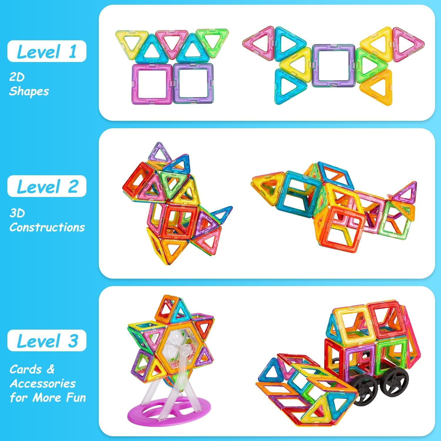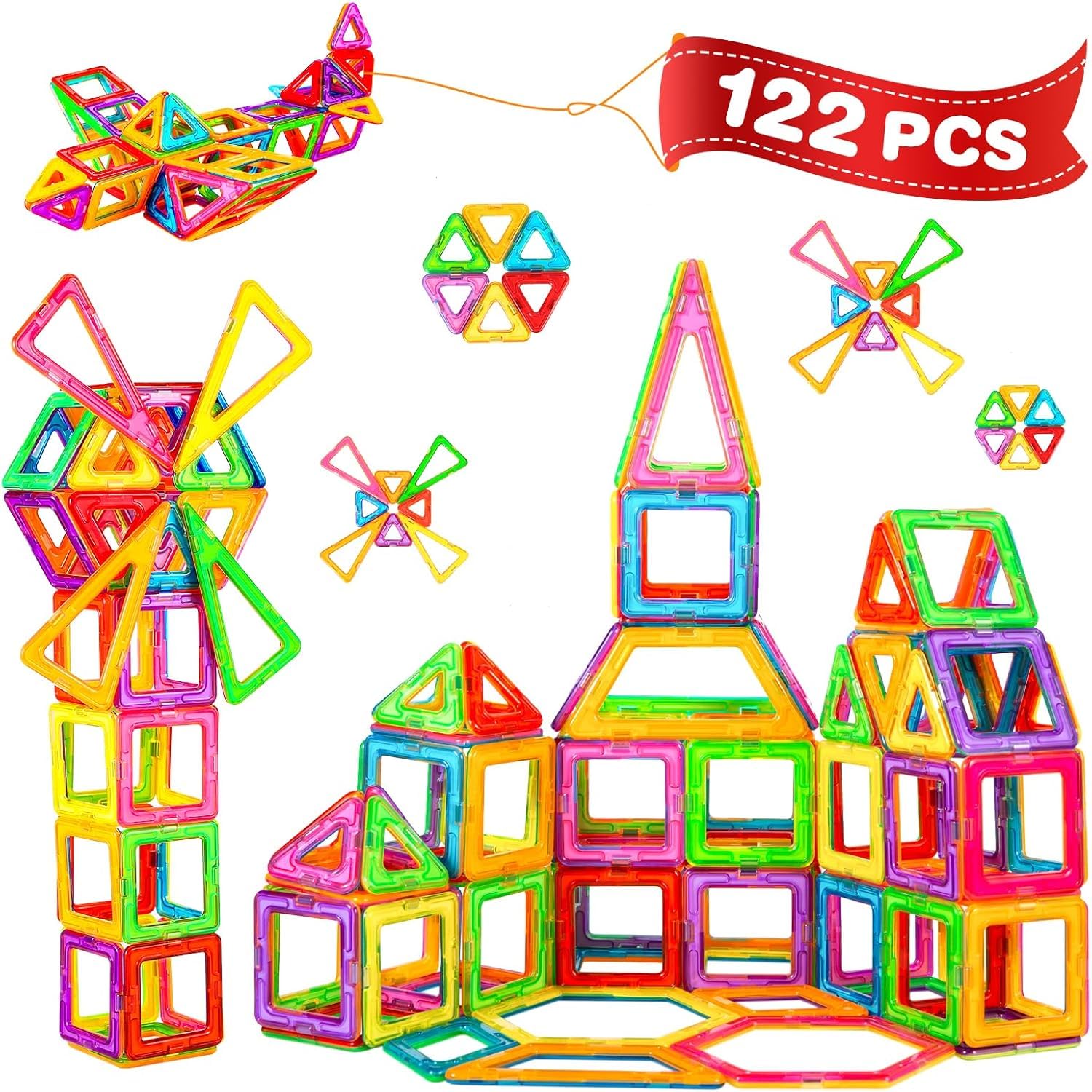 ["đăEducational Complete SolutionăWith 122 tile magnetic building blocks set, children can build 2D or 3D constructions like castles, Ferris wheels, and robots to promote their cognitive development, spatial imagination, and STEM skills.","đăPremium Safety & CompatibilityăMade of food-grade material with rounded edges, making the magnetic building blocks safe for children to handle. Standard sizes (square: 2.56 inches; triangle: 2.17 inches) ensure compatibility with magnetic blocks from other brands.","đăSTEM Montessori & Sensory ToyăThe Crenova magnetic building blocks are available in various colors and shapes, making it a fun and exciting STEM toy for kids. The variety of geometric shapes (hexagons, rectangles, etc.) allow for complex architectural projects. Magnetic blocks train children's kinesthetic intelligence and problem-solving skills as they transition from 2D to 3D.","đăGreat Toy for Practical Everyday LifeăThe Crenova magnetic building blocks are the perfect tool for building, creating, and learning. Ideal for travel, school, or a tidy playroom. The washable surfaces ensure long-term play value and are the perfect toy for children aged 3 and above.","đăDiverse Magnetic Building Block SetăThe 122-piece set includes 24 triangles, 30 squares, 2 hexagons, 2 semicircles, 2 rectangles, 4 isosceles triangles, 4 diamonds, 2 trapezoids, 4 sector segments, 2 arches, 26 letter cards, 16 number cards, 1 Ferris wheel, 2 wheels, and 1 box.","đăGreat Toy GiftăCrenova magnetic building blocks set is the perfect gift for children on special occasions like birthdays, Christmas, and graduations. This magnetic building block gift will be a hit with children of all ages!"]