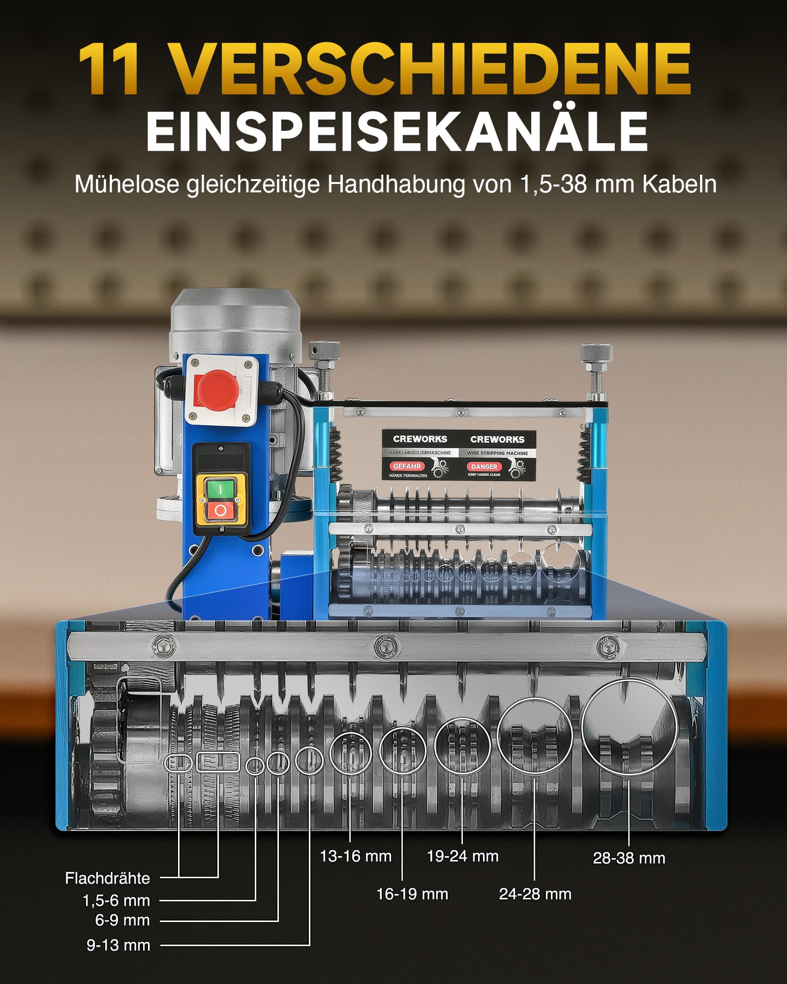 CREWORKS Electric Wire Stripping Machine 370W Cable Peeling Machine Wire Stripper Tool 11 Holes 10 Blades 1.5-38 mm Wire Stripping Peeling Machine
