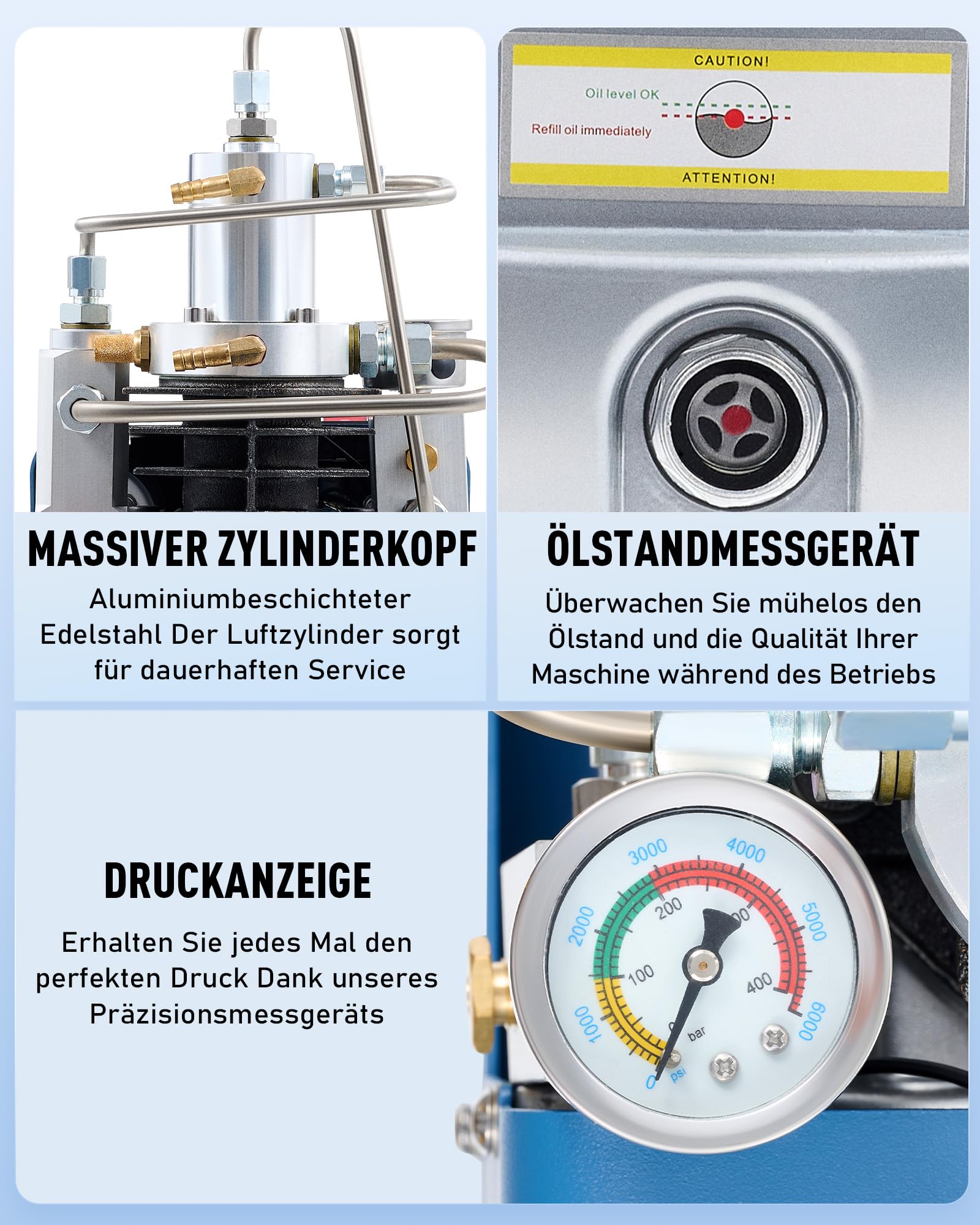 "Attention - The air rifle compressor must be operated with oil. Pay attention to the oil level. This product cannot be used directly for scuba tanks and must be used with a breathing filter."]