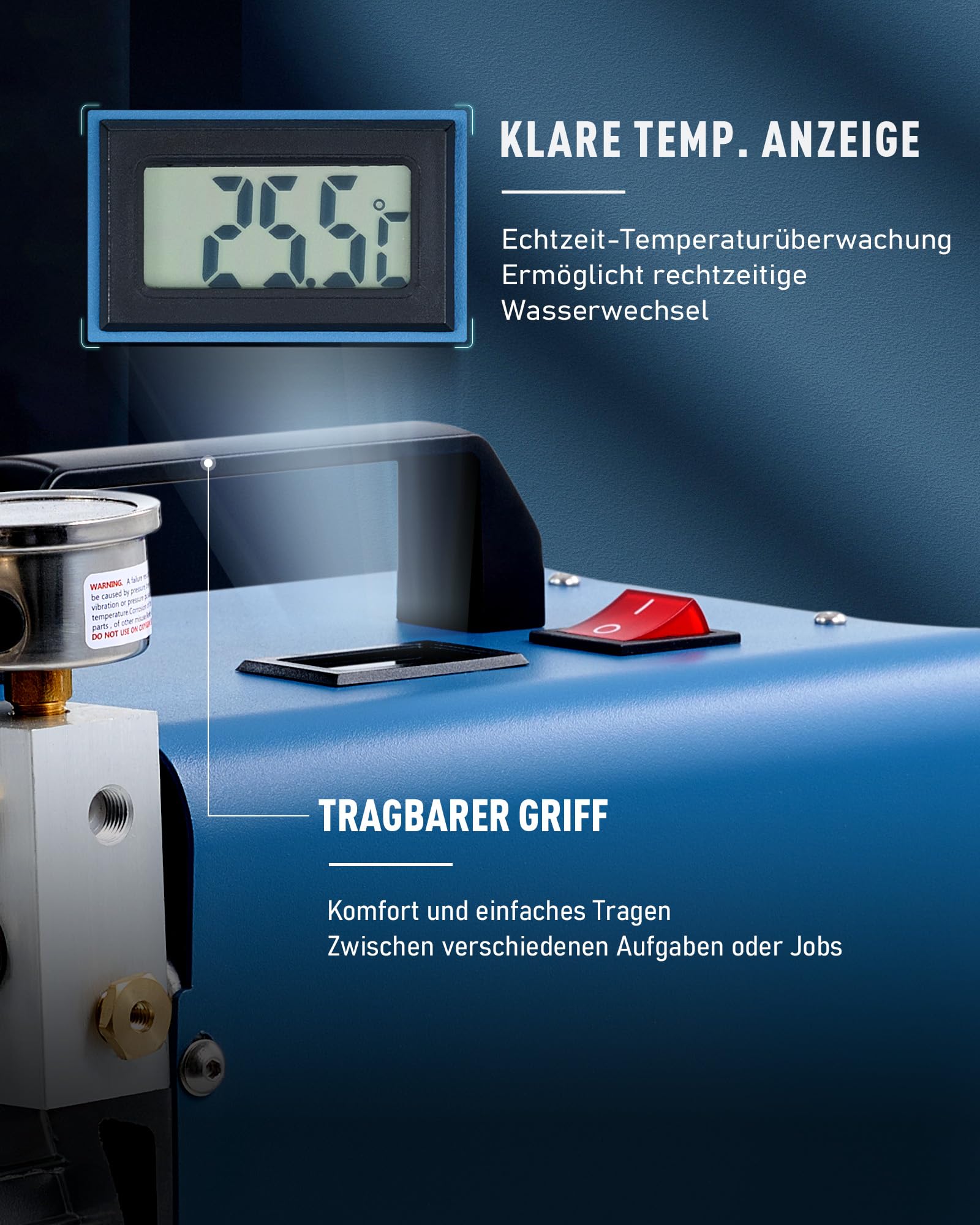 "Plastic-coated for safety and waterproof performance. High-pressure stainless steel tank, machine body made of aluminum alloy and brass. Imported pressure gauge.",