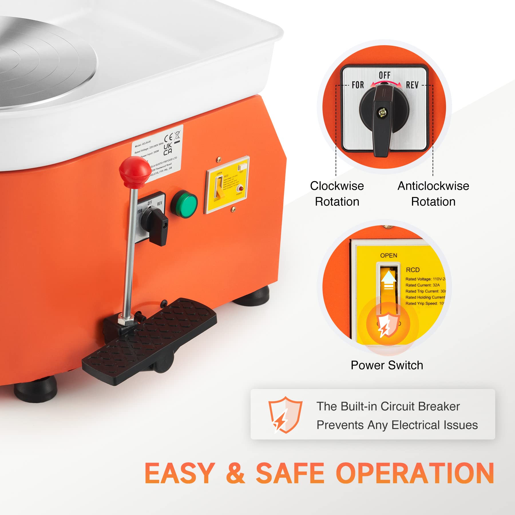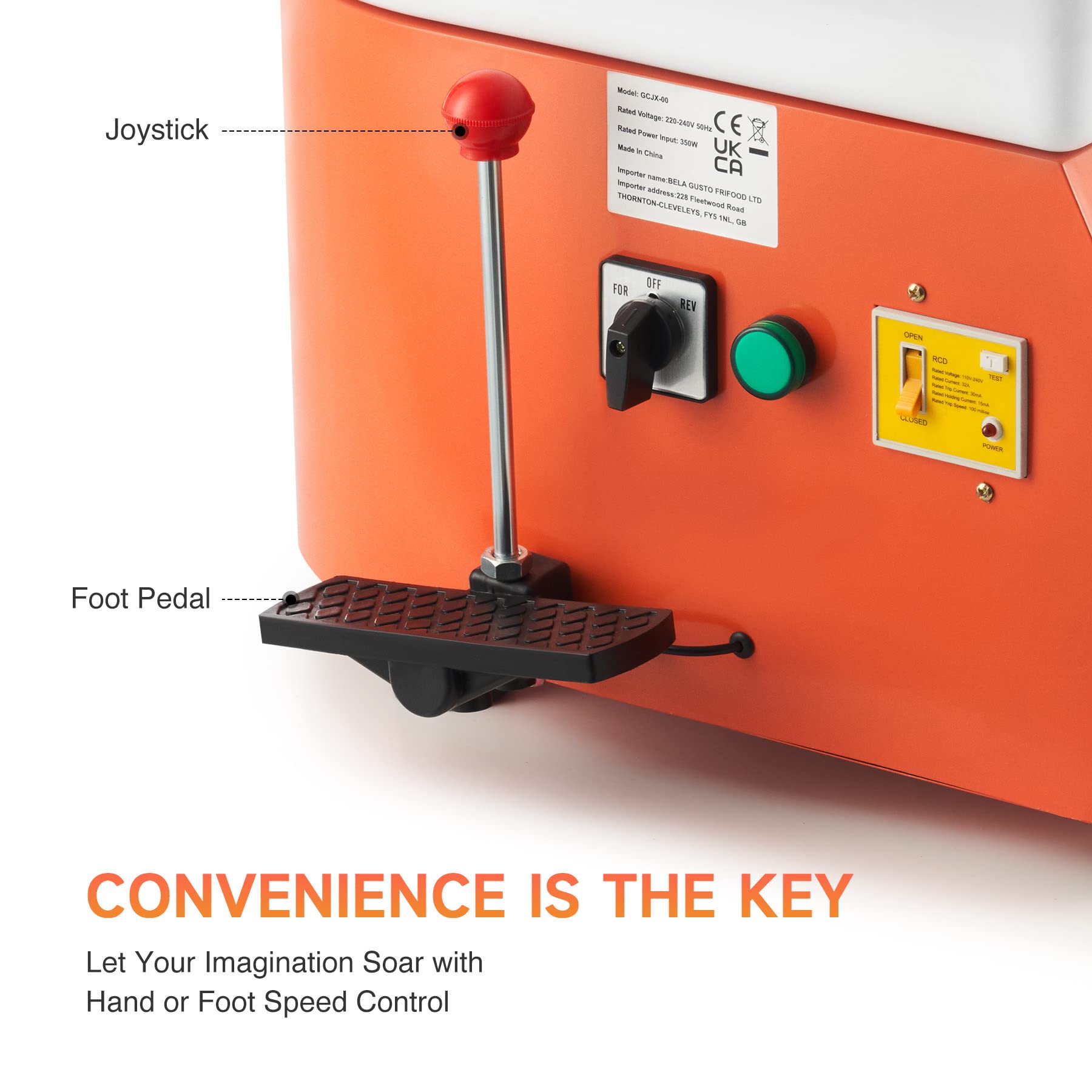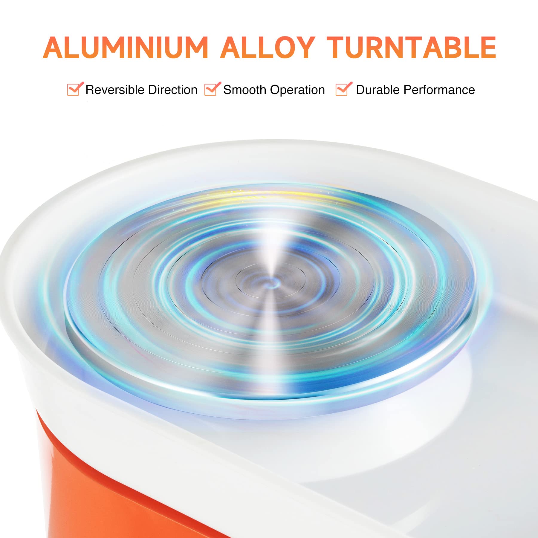 "Hand or Foot Control - With the convenient foot pedal and hand lever that controls the speed of your turntable (up to 300 RPM!), you can focus on your work with one hand or both hands.","Durable & Safe to Use - The aluminum turntable of our pottery wheel machine provides durable corrosion-resistant performance, while the easy-to-clean ABS splash pan provides excellent mud shielding and the built-in safety switch ensures your safety and enhances your pottery experience.","Quiet & Reversible Motor - This premium electric motor runs quietly and smoothly, offering both forward and reverse rotation for right and left-handed users.","Sculpt like a Pro - This pottery wheel comes with an 8-piece clay shaping and carving tool set, allowing you to start creating your own unique pottery pieces right away.","Fun for All - CREWORKS' electric pottery wheel with a reversible 25-cm turntable and a powerful 350W motor is a hit for all ages and skill levels, versatile enough for use in all types of pottery studios, but also portable enough for children to use in or out of art class."
