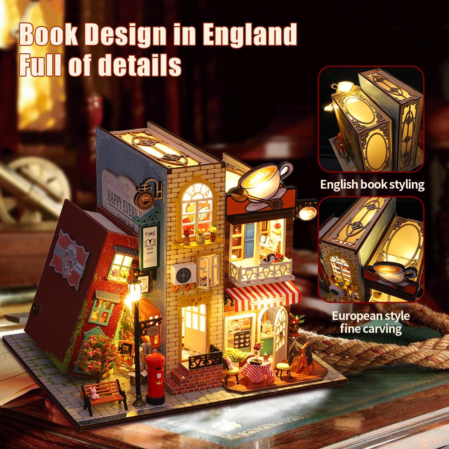 CRIOLPO Book Nook Kit - DIY dollhouse wooden miniature house kit, book corner miniature kit for adults, teens; 3D wooden puzzle bookshelf insert kits with sensor LED light - outside the book.