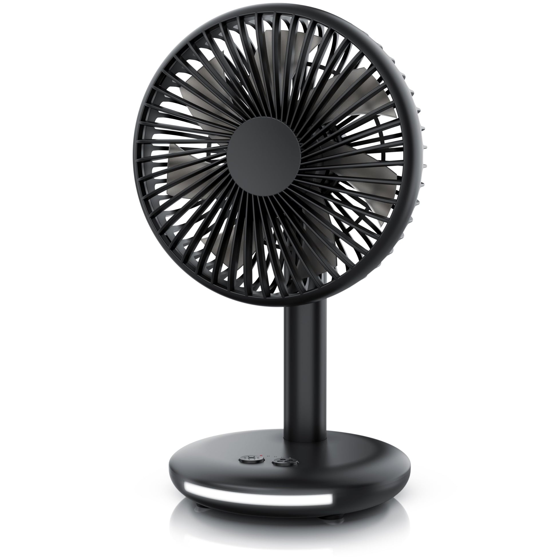 ["PREMIUM BATTERY DESK FAN WITH HIGH-QUALITY DC MOTOR for efficient and extremely quiet operation. The brushless motor offers up to 60% energy savings compared to standard devices with AC drive. WHISPER-QUIET: You benefit from a fresh air flow, but only hear a quiet noise of 39 dB(A) in speed 1 and 46 db(A) in speed 3. | 307284","3 SPEED SETTINGS allow adjustment to different room temperatures and personal preference. In NATURAL MODE, speeds alternate between gentle and strong, creating a natural airflow sensation. Ideal for hot days. | CHARGE AND USE: the fan can be operated while charging directly.","LED LIGHT STRIP IN THE BASE: The built-in LED light strip not only creates a pleasant atmosphere but also serves as a convenient additional lighting with two brightness levels. Whether as a soft night light in the bedroom or subtle lighting on the desk - the light strip creates a pleasant environment and saves space, as no separate lamp is required.","PRODUCT ADVANTAGES: Compact LED battery desk fan with Li-Ion battery 3.7 V, 2000 mAh | High-quality DC motor | Very quiet operation: 39 dB(A) (Speed 1) to 46.5 dB(A) (Speed 3) | Swivel rotor head 45° (5° down, 40° up) | 3 speed settings | Natural mode | Running time up to 8 hours (Speed 1) | Light strip in the base | 2 brightness levels; up to 27 hours burn time | USB-C charging input","DIMENSIONS: Height 22.5 cm x Width 13 cm x Depth 11.5 cm | Weight: 288 g | IN THE BOX: LED battery desk fan incl. USB A to C charging cable and user manual."]