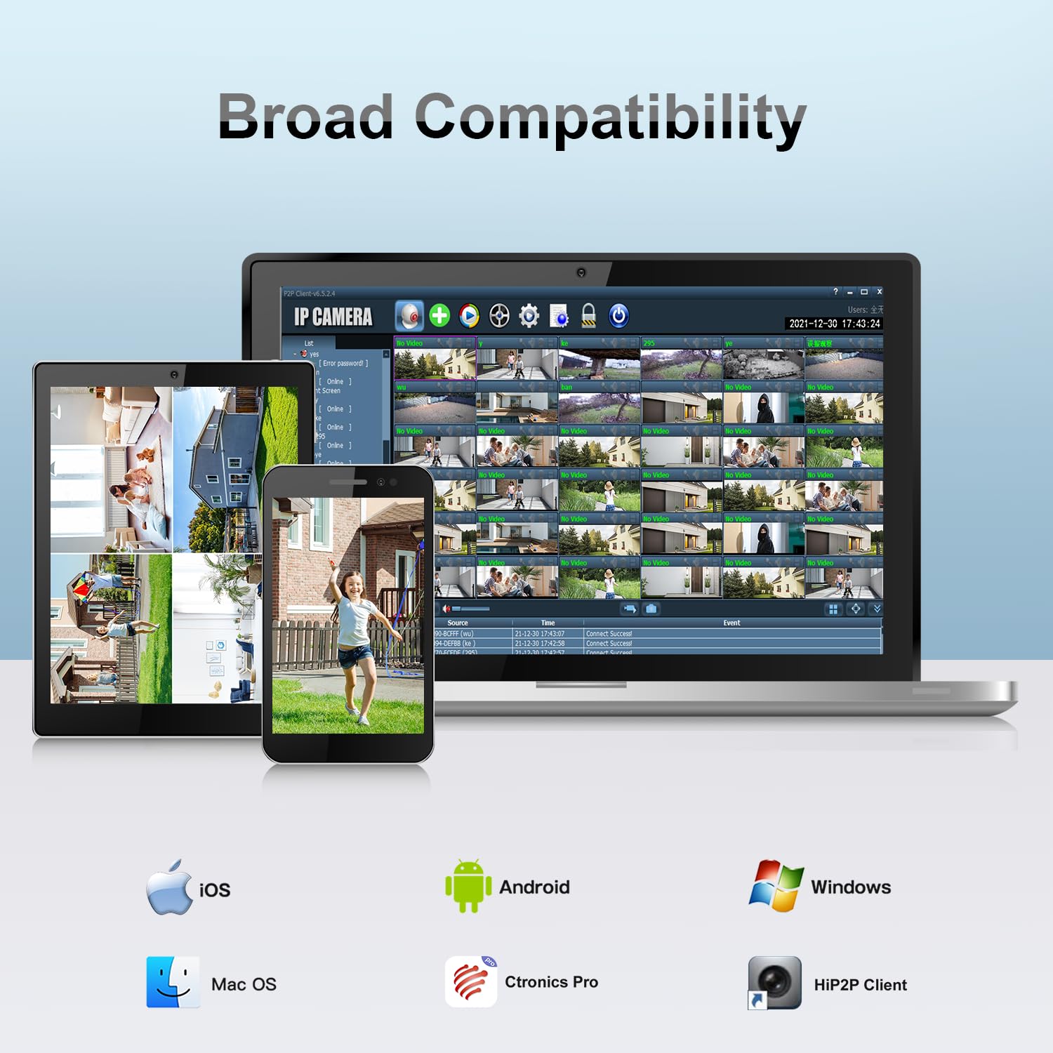 ["TF Card Slot & Remote Access"] This outdoor surveillance camera has a slot for the Micro TF card up to 64GB, images and videos are stored on the TF card. The surveillance camera is compatible with NVR, APP "Ctronics" supports iOS/Android systems, PC software MAC/Windows is HiP2P, which supports the P2P service. It allows you to view the recording anywhere and anytime. (TF card is not included)
