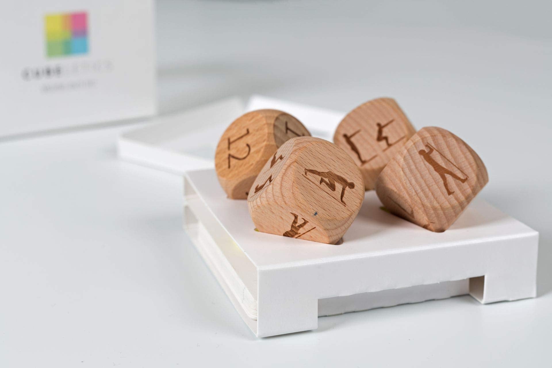 "YOUR CUBELETICS 1 cube for strengthening the front, 1 cube for strengthening the back, 1 cube for strengthening the legs, 1 repetition cube, 18 explanation cards, 1 transport pouch",