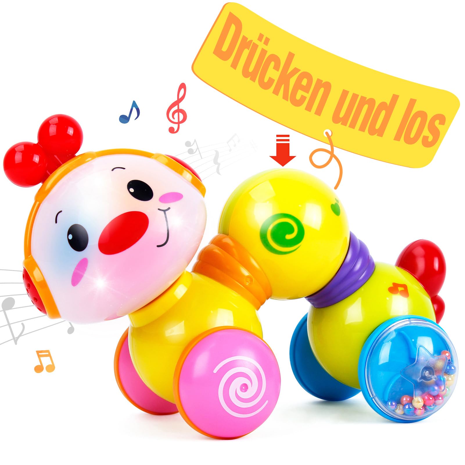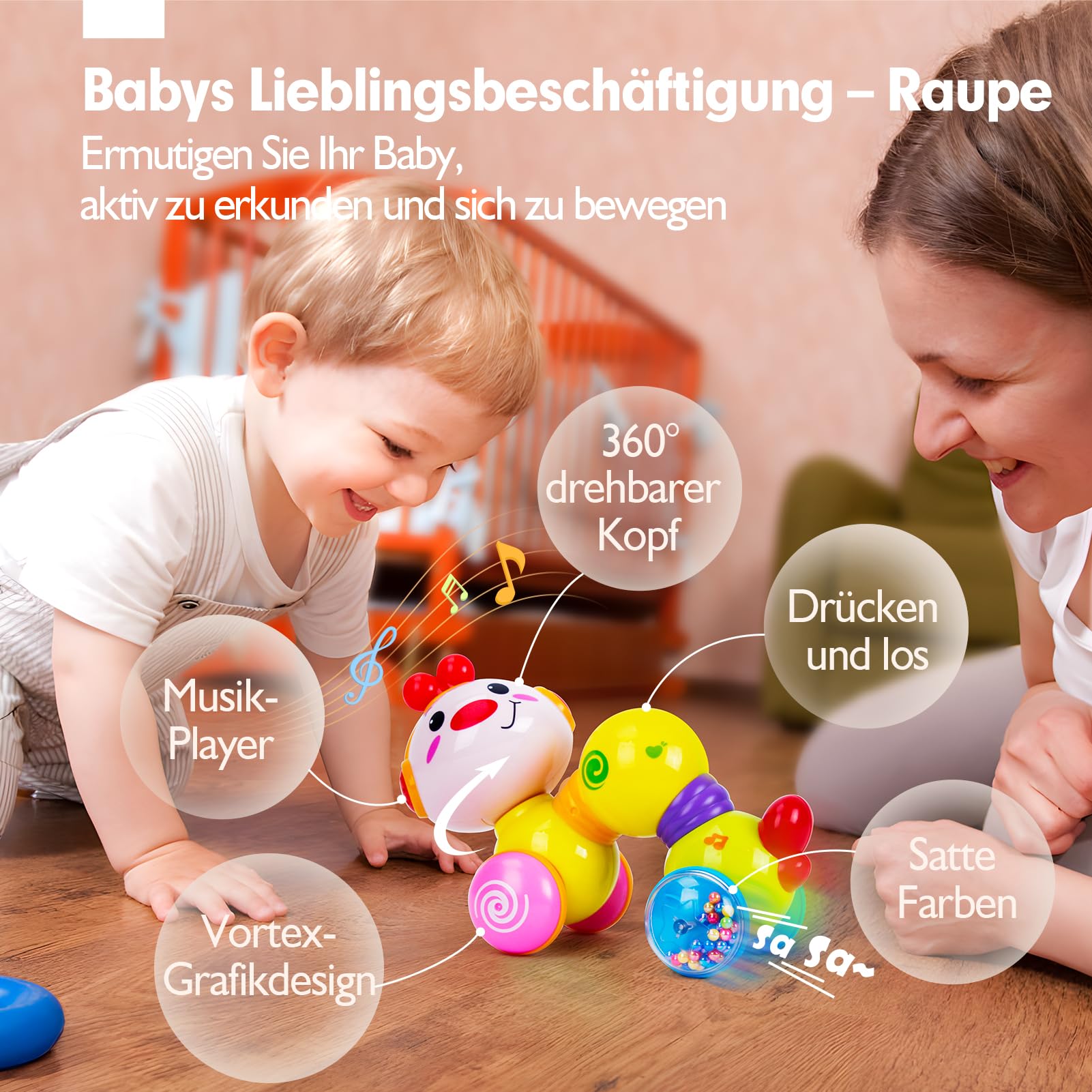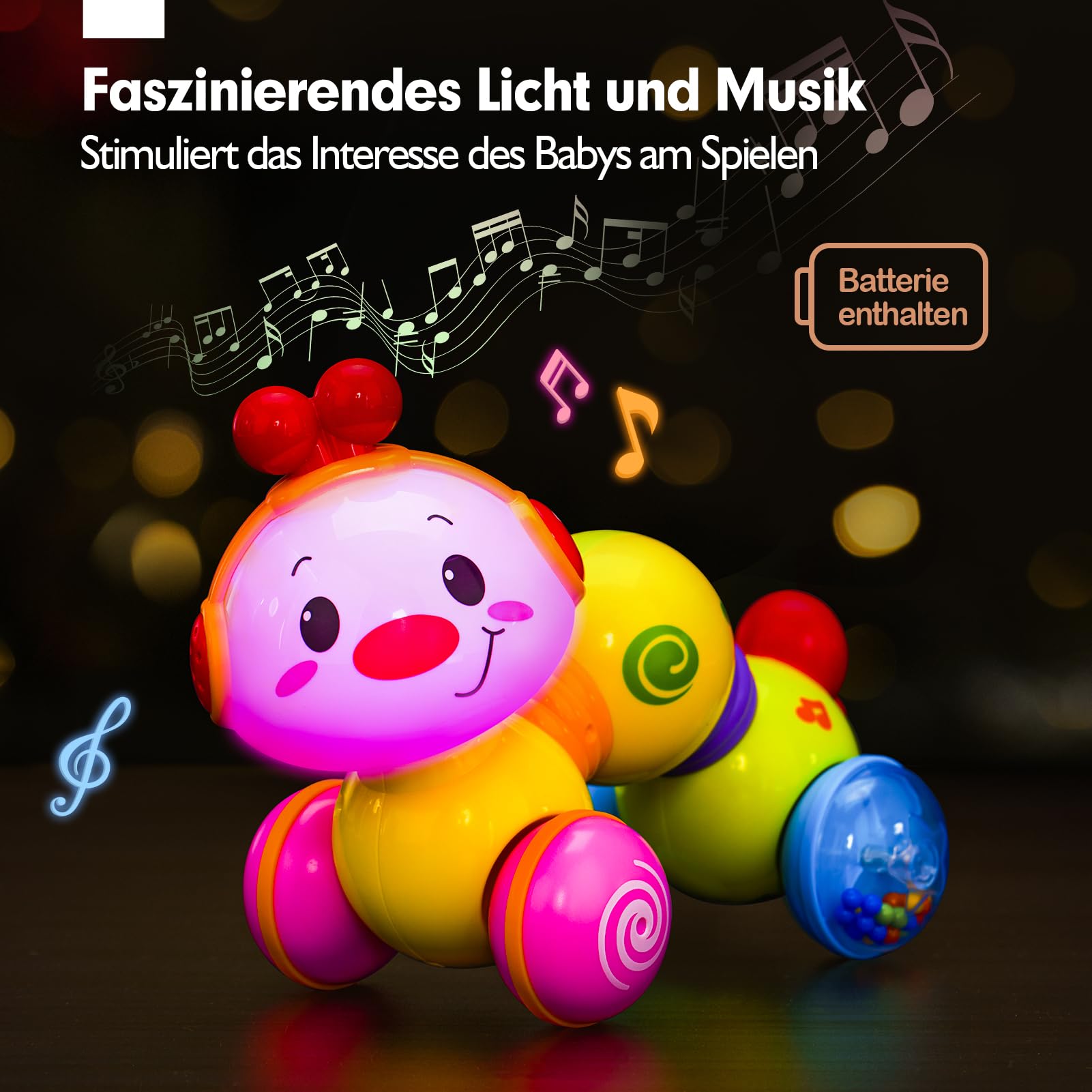 ["đăSafe & High-QualityăThis baby toy from 6 months is made of sturdy, BPA-free ABS material with smooth, edge-free edges - ideal for small children's hands. The durable construction ensures worry-free play and is an excellent choice as a first electronic toy for 6-month-old curious explorers.","đăVaried Stimulation for Little ExplorersăThe rotating head, rotating spiral patterns, and clacking beads provide exciting stimuli for eyes and ears. As a versatile tummy time toy, the toy accompanies your child through multiple stages of development - even on carpets, it moves reliably and stably.","đ”ăMusic & Light Effects for Multi-Sensory PlayăA press on the left ear activates cheerful melodies and gentle glowing on the caterpillar's face - perfect for promoting auditory perception and visual-auditory coordination. This interactive baby toy at 6 months ensures long-lasting excitement and learning fun.","đ€žăCrawling Fun with Learning FactorăPress the body of the caterpillar down and let it go - the movement begins! This baby toy motivates crawling and supports important developmental steps like tummy time, balance, and muscle strength - an ideal crawling toy for active babies.","đăGrows with - the Perfect GiftăWhether as a 1-year-old baby toy or for younger children: The combination of movement, sound, and light makes this toy a loyal companion. Ideal as a gift idea - a baby toy from 6 8 9 12 months that promotes babies and delights parents."]
