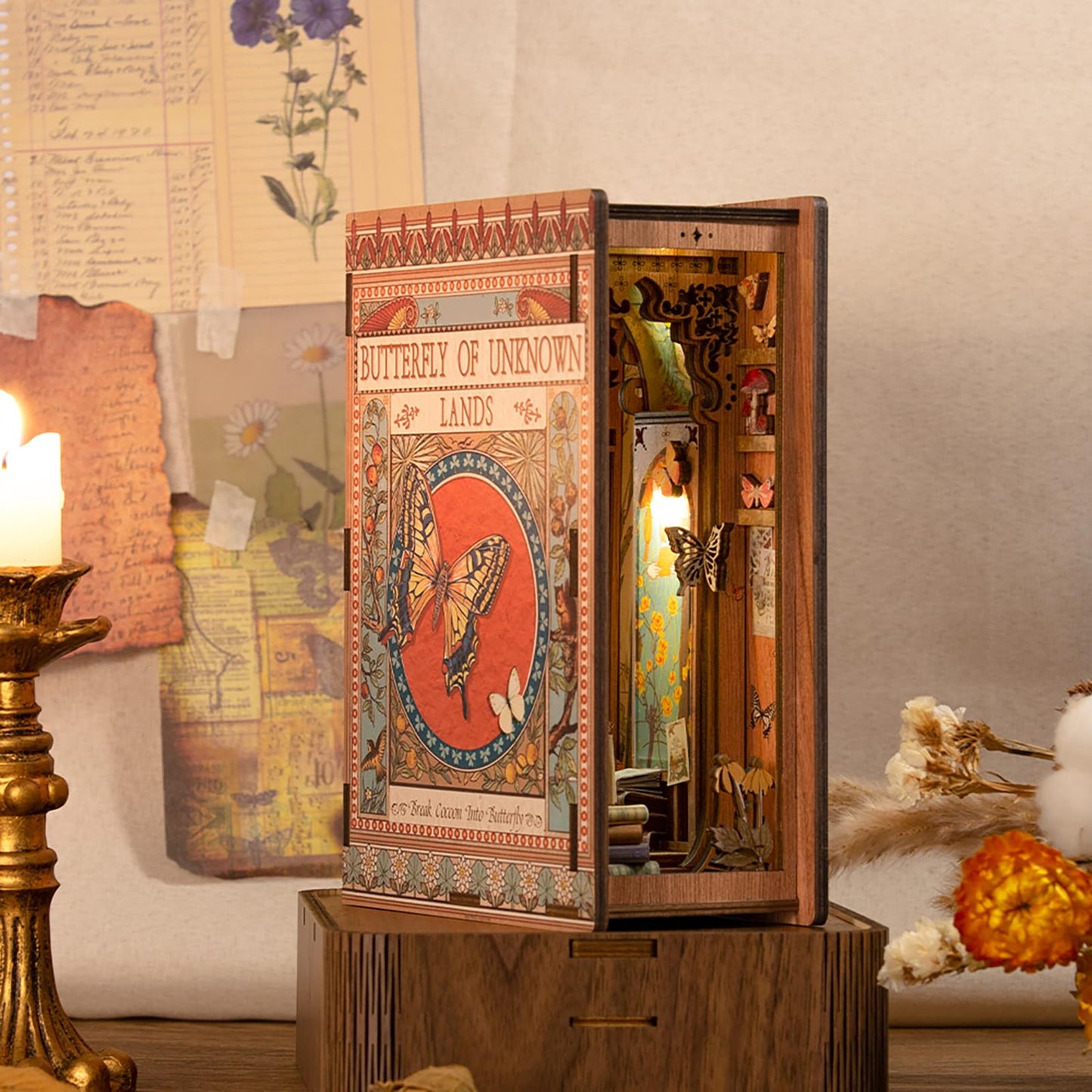 CUTEBEE DIY Book Nook Kit - DIY dollhouse miniature house kit with furniture and LED light, 3D wooden puzzle bookends, model kits for adults to build (Butterfly of Unknown Lands)