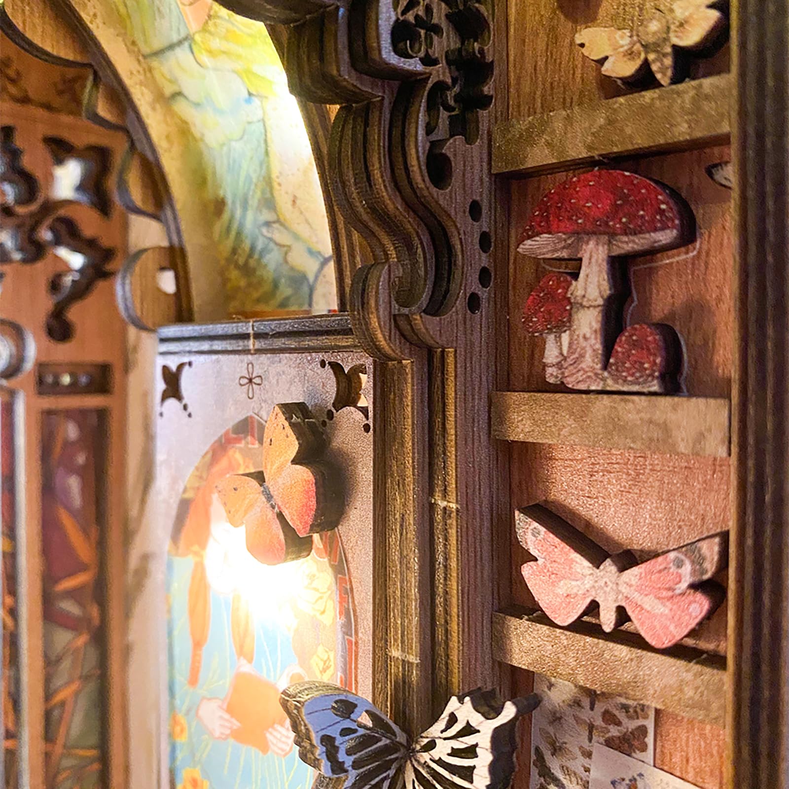 "Unique Design Concept: Inspired by forgotten and lost places, this book nook features a variety of colorful butterflies, wild plants, books, and traces of human life found in abandoned old buildings. It is full of ancient, mysterious, lonely, and vibrant atmosphere, like a lost paradise.",