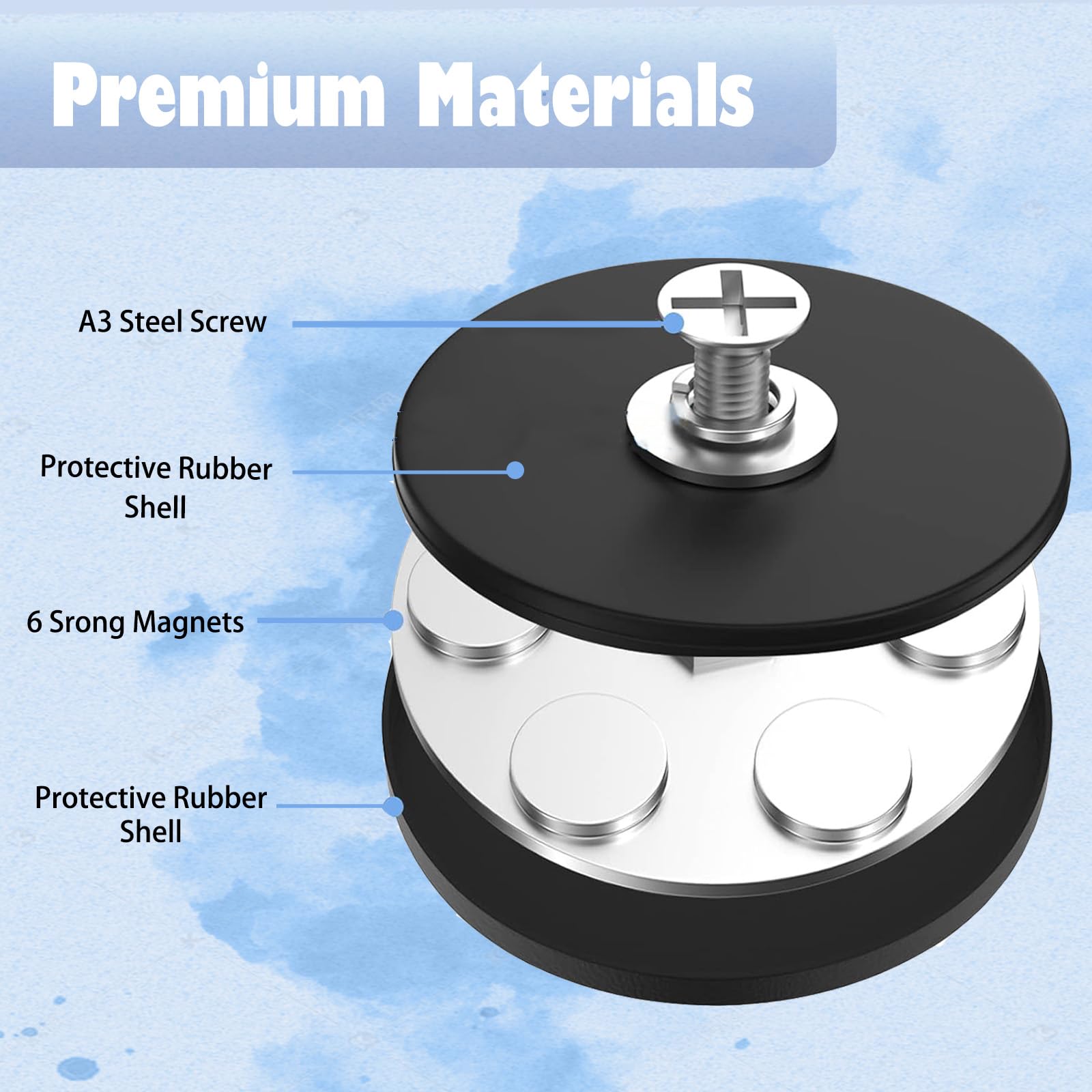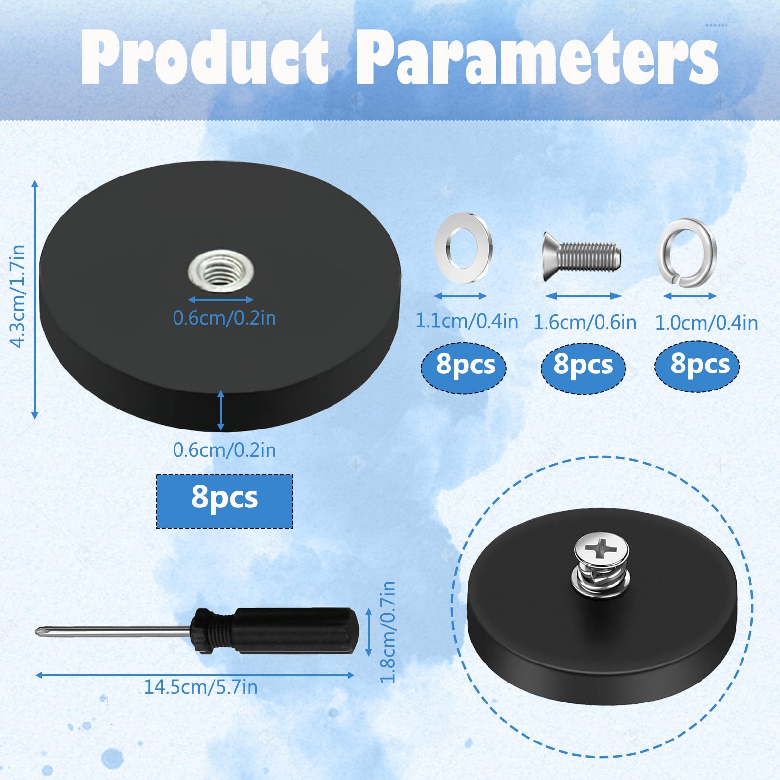 ["【High Strength Neodymium Magnet】: The round base with 6 neodymium magnets has a SUPER vertical magnetic attraction of OVER 33 lbs on a 6 mm thick steel plate base. The positive and negative poles are separated to form a closed static magnetic field that does not interfere with electronic devices signals. Magnet Size: 43 x 6 mm; Thread Size: M6.","【High-Quality Materials for Durability】: Made of NdFeB magnets, A3 steel, silicone, and copper-nickel, Cveenk magnets have a good texture and excellent magnetic permeability. Package includes: 8 x Neodymium Magnets Rubber Coated Ø 43mm; 8 x Nut; 8 x Spring Washer; 8 x Flat Washer; 1 x Screwdriver.","【Anti-Scratch and Anti-Slip】: The rubber-coated neodymium magnets are equipped with a double-layer rubber coating, which provides a soft material with high friction and excellent adhesion. The double-layer rubber coating protects the magnet from damage, avoiding scratches on painted surfaces. The anti-slip coating improves lateral load-bearing capacity and ensures a secure grip, even on slippery surfaces.","【Waterproof & High-Temperature Resistant for Outdoor Use】: Water-repellent and wear-resistant rubber coating with a maximum operating temperature of 176°F. They are highly resistant to external influences and can be used outdoors for long periods of time.","【Multifunctional Use】: The magnet has M6 bolts, ideal for screwing and mounting without drilling or gluing. The spring washer included in the package can provide better slip resistance and firmly fix your tools. Rubber-coated magnets allow you to attach the desired objects to a variety of metal surfaces, ideal for cameras, car lights, doorbells, automatic devices, solar lights, tools, and machinery."]