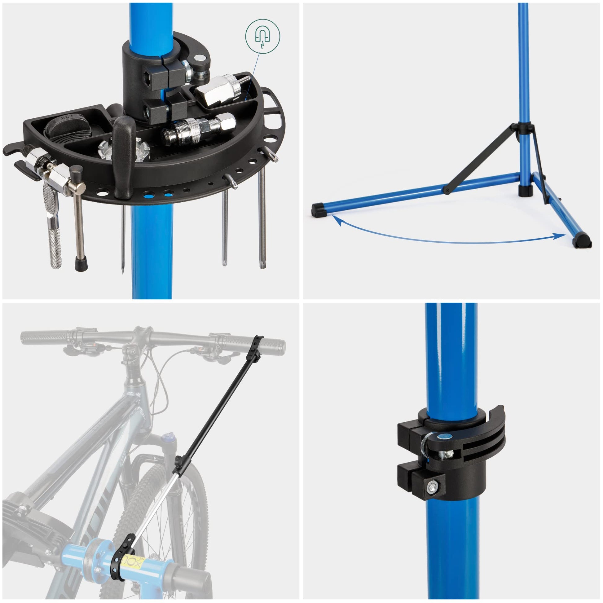 ["360° Rotatable Clamp & Height Adjustable Body - The clamp with a lever can securely fasten your bike. Thanks to the telescopic pole, this repair stand is height adjustable, making it comfortable for your waist during repairs.",