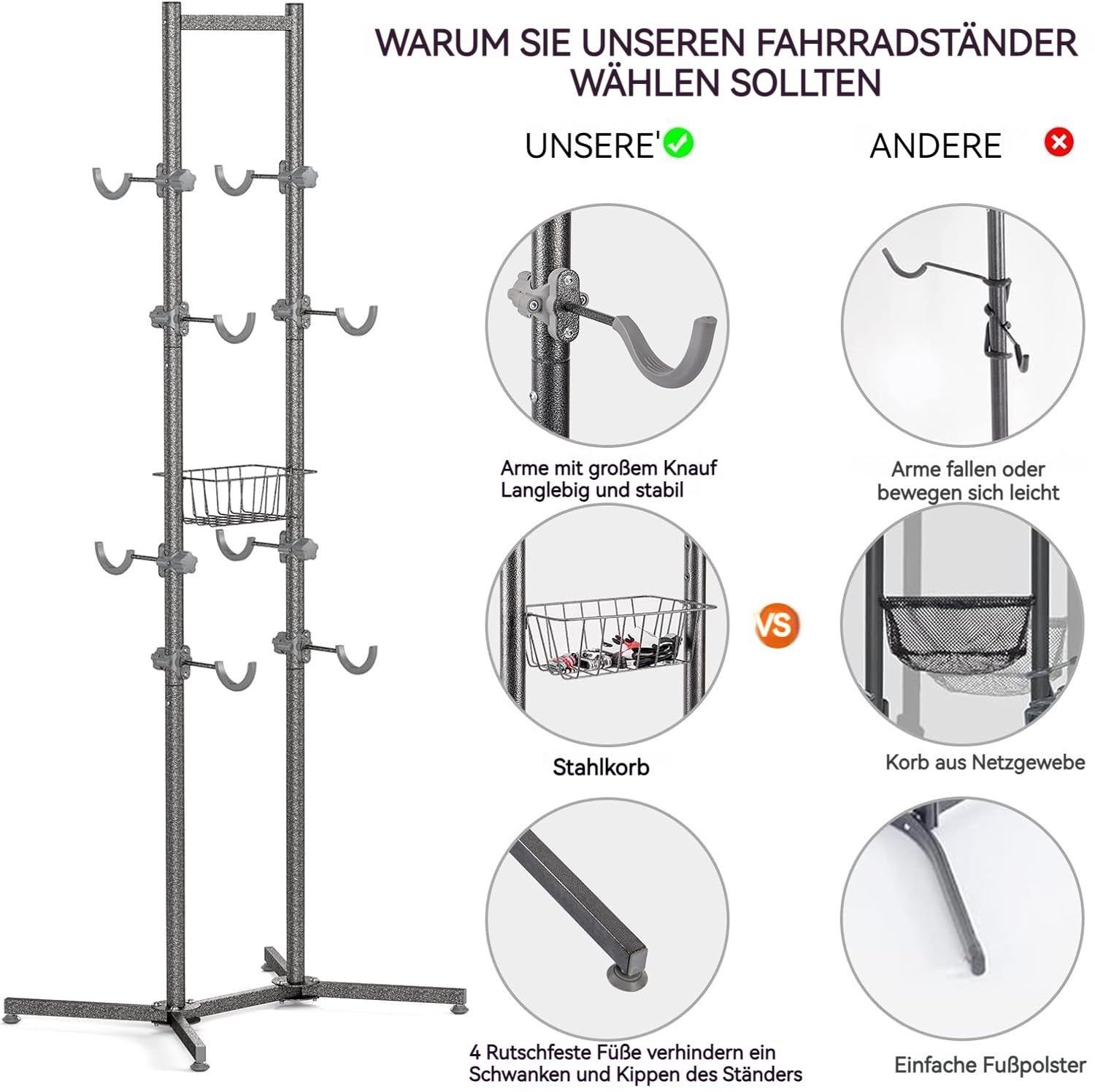 ["MAX LOADING 154 lbs - This bike stand can be loaded up to 154 lbs and is suitable for 4 bikes, Maximum load per hook: 35 lbs, Maximum weight per bike: 40 lbs.","STABLE & LIGHT - This bike stand floor made of aluminum alloy body and 3 legs design, it is more stable.","UNIVERSAL USE - It supports MTB, road bike, and E-bike.","FOLDABLE & EASY TO STORE - This bike stand can be folded so that it can be conveniently stored when not in use or taken in the car when driving.","ANTI-SCRATCH ARMS DESIGN - Fully adjustable supports feature rubber sashes to prevent chipping and scratches, locking knobs easily turn to match your ideal height position, making it easy to mount difficult bike frames."]