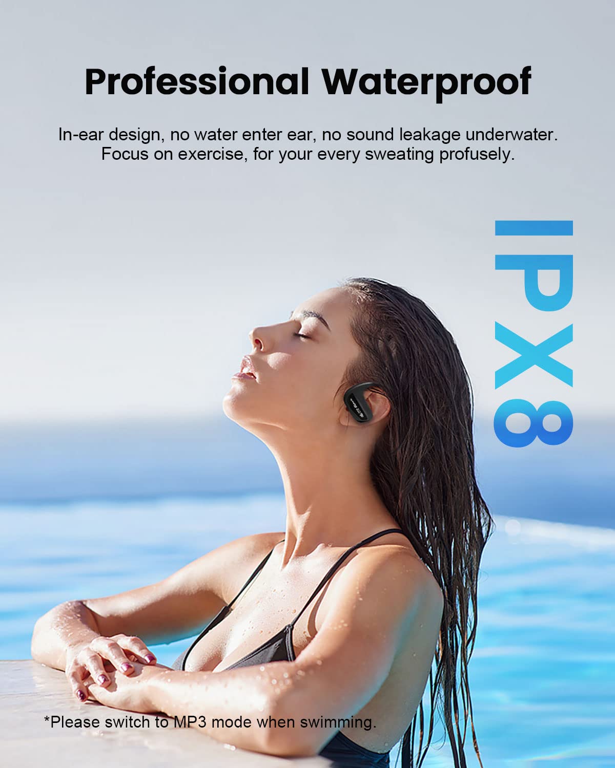 ["【Upgrade Bone Conduction Waterproof Speaker】 - Equipped with waterproof bone conduction speaker technology, with 10mm nano-composite film delivering a wide dynamic range. Compared to traditional speakers, bone conduction speakers have higher water resistance and are not easily damaged when immersed in water.","【Highest IPX8 Waterproof】 - IPX8 Waterproof headphones ensure you can enjoy music even while sweating or swimming. Magnetic charging is highly waterproof, sports headphones are suitable for swimming, gym, running, and cycling.","【16GB MP3 Player with Headphones】 - Swimming headphones have a 16GB memory, you can delete/download over 5000+ songs or manage music folders through the computer. Switching to MP3 mode allows you to truly set aside your phone during workouts.","【Bluetooth 5.0】 - Bluetooth 5.0 chip provides a stronger and faster connection. Supports calls, built-in microphone with noise cancelation provides you with HD audio. 250mAh large capacity lithium battery has 24 hours of playback time, fast charging within 1.5 hours, power display, real-time control.","【Please Note Before Ordering】 - Since Bluetooth cannot transmit underwater, the Bluetooth mode cannot be connected to phones underwater. It is recommended to switch to MP3 mode before swimming. Not compatible with Mac OS computer systems. Please use a different computer system to download music."]