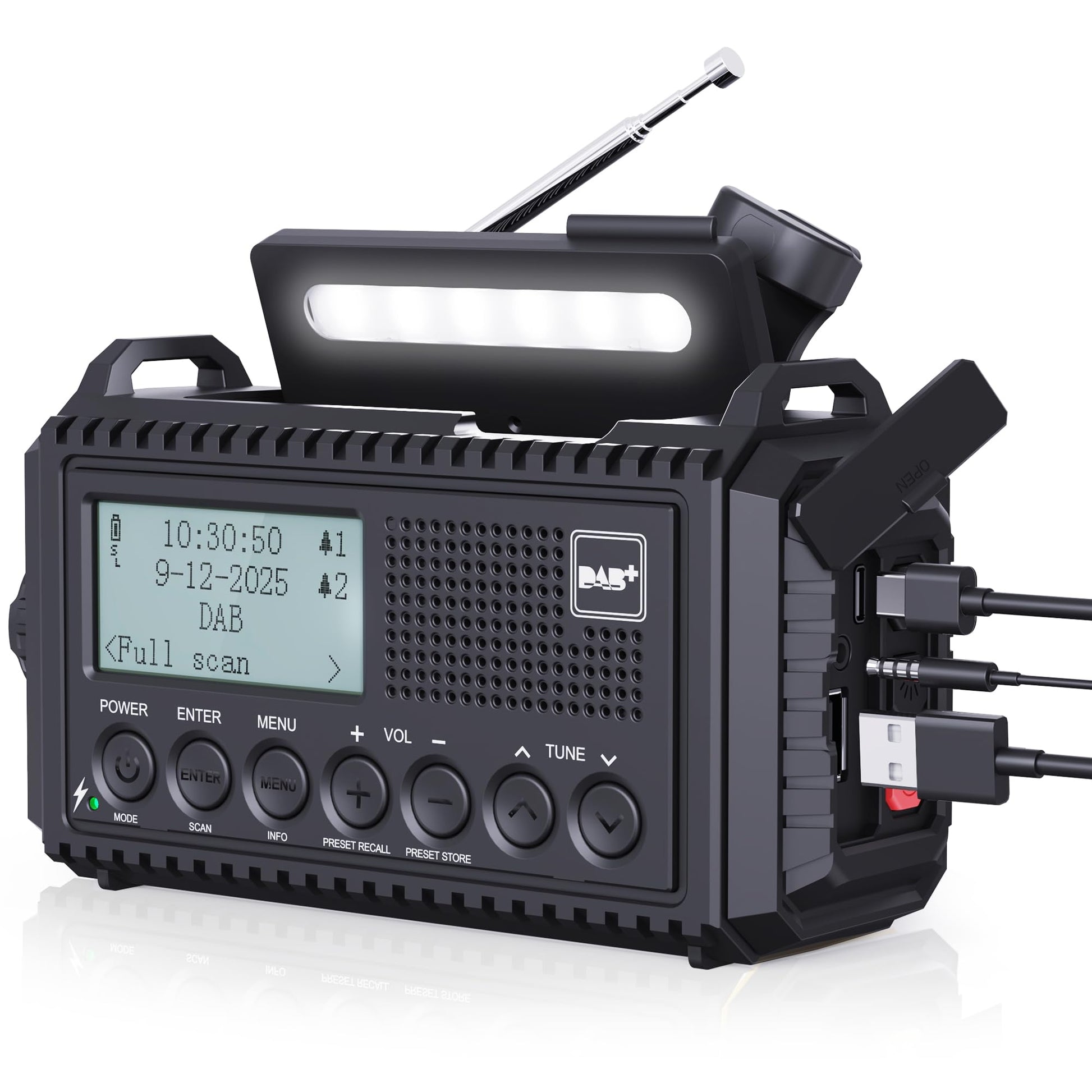DAB/DAB+/FM digital radio with built-in 5000mAh battery. Solar radio emergency radio with USB mobile phone charging function. Camping radio with LED flashlight, reading light, SOS alarm. Portable crank radio for outdoor use.