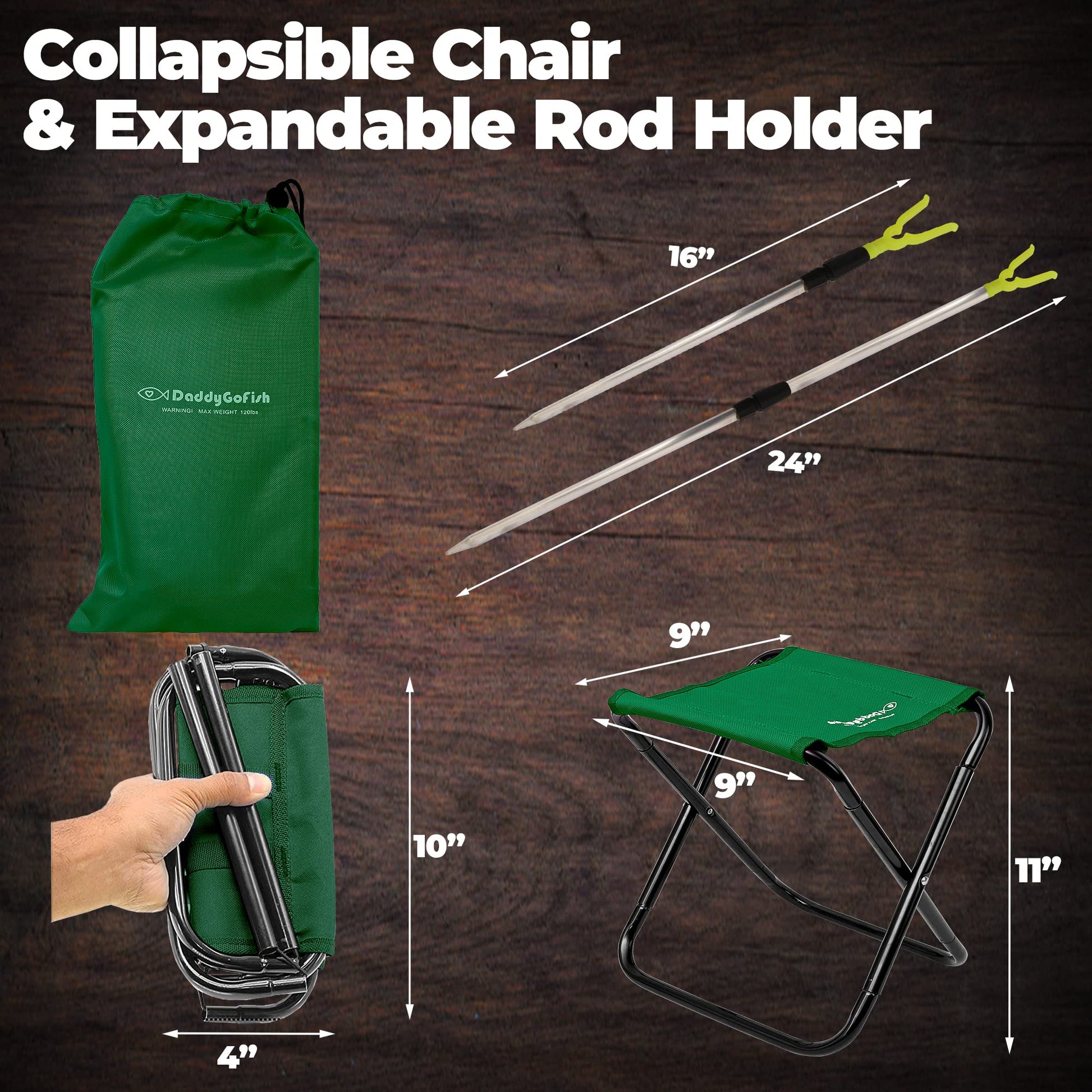 DaddyGoFish Kids Fishing Kit - Telescopic Rod & Reel Combo with Folding Chair, Rod Holder, Tackle Box, Bait Net, and Carry Bag for Boys and Girls - Green, 5ft
