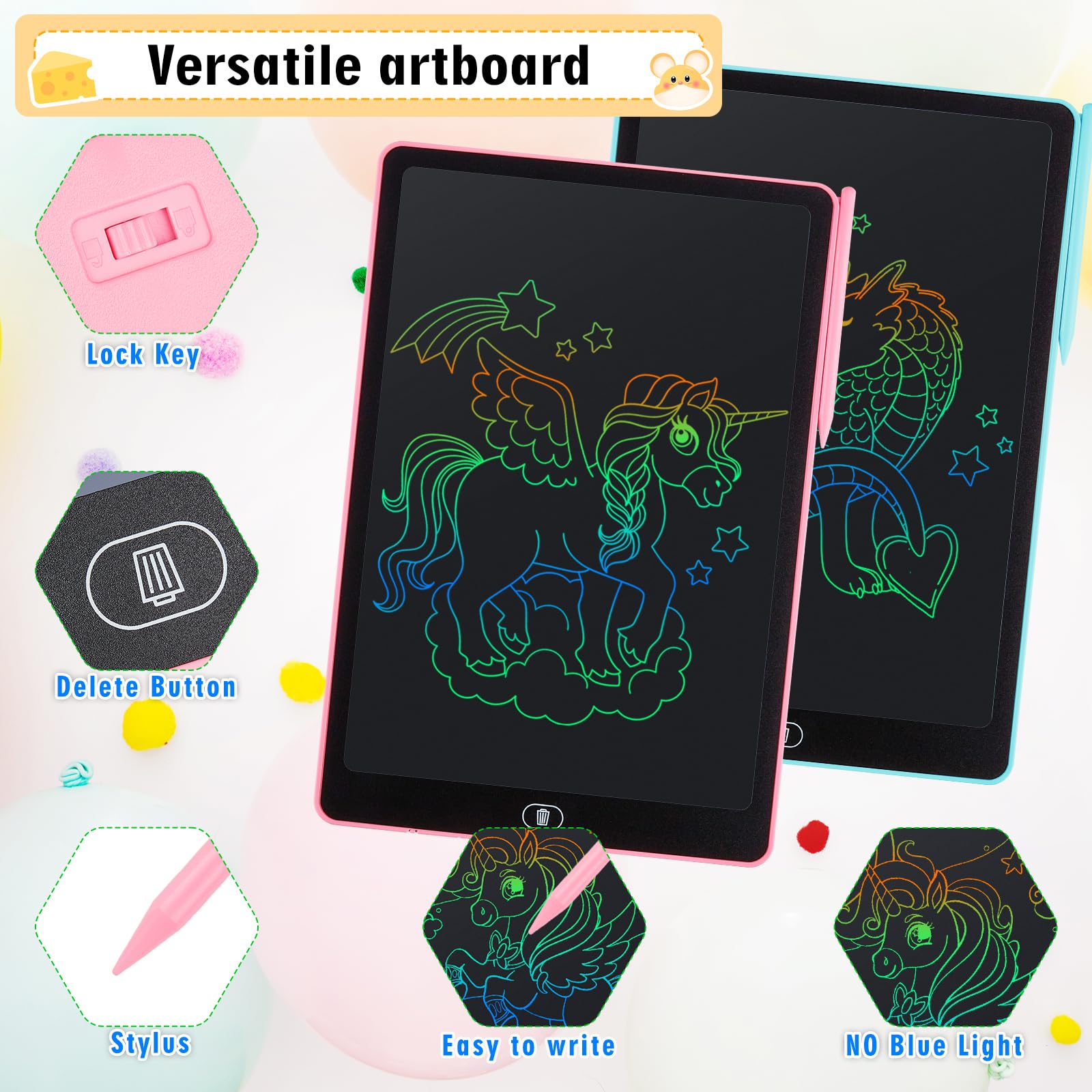 ["2 Packs LCD Writing Tablet Kids + Animal Stickers: Let kids develop their creativity and imagination! The LCD screen has no blue light, the light is soft and protects the eyes. Don't worry about children's eyes being damaged by long hours of TV or computer screens!","Interesting Magic Slate: This drawing board for kids is like an endless piece of paper, providing you with fun writing and drawing. You can draw, write, doodle, take notes, even use it as a memo pad in the office or as a message board at home.","EASY TO USE AND BEAUTIFUL DESIGN: The LCD writing tablet features pressure-sensitive technology to produce colorful lines of different thicknesses, depending on how hard you press with a pen or fingernail, just like writing and drawing on paper. Click the lock button to lock, effectively preventing accidental erasure and erase the pattern after unlocking. Quick erase with just one button, convenient and time-saving!","READY FOR DRAWING: The durable plastic LCD writing tablet doodle board is portable and easily fits in school bags, handbags, and travel bags. The drawing board is waterproof and drop-resistant, suitable for many occasions: cars, planes, outdoor places.","Gift for Kids: LCD Writing Tablet, it is a good partner for children, an attractive toy for kids that can not only stimulate their creativity but also promote parent-child interaction. Suitable as a variety of holiday gifts, including school office, birthday, Thanksgiving, Easter, Christmas, Valentine's Day, and more."]