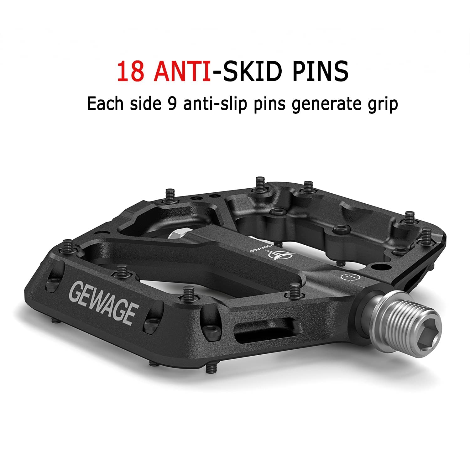 【Non-slip and great grip】: The flat mountain bike pedals with 9 interchangeable steel pins per side provide excellent grip and a secure ride on rainy days and bumpy roads.
