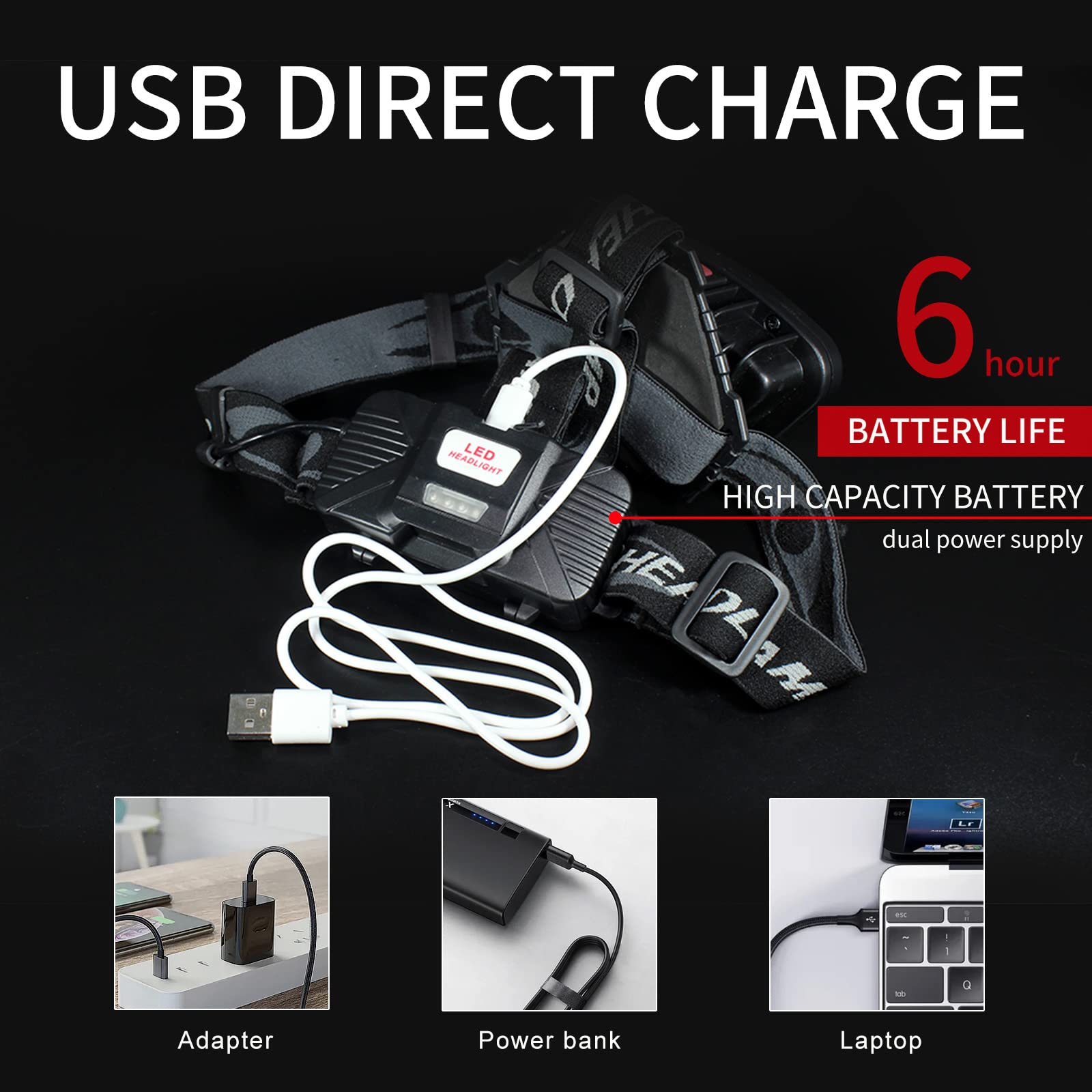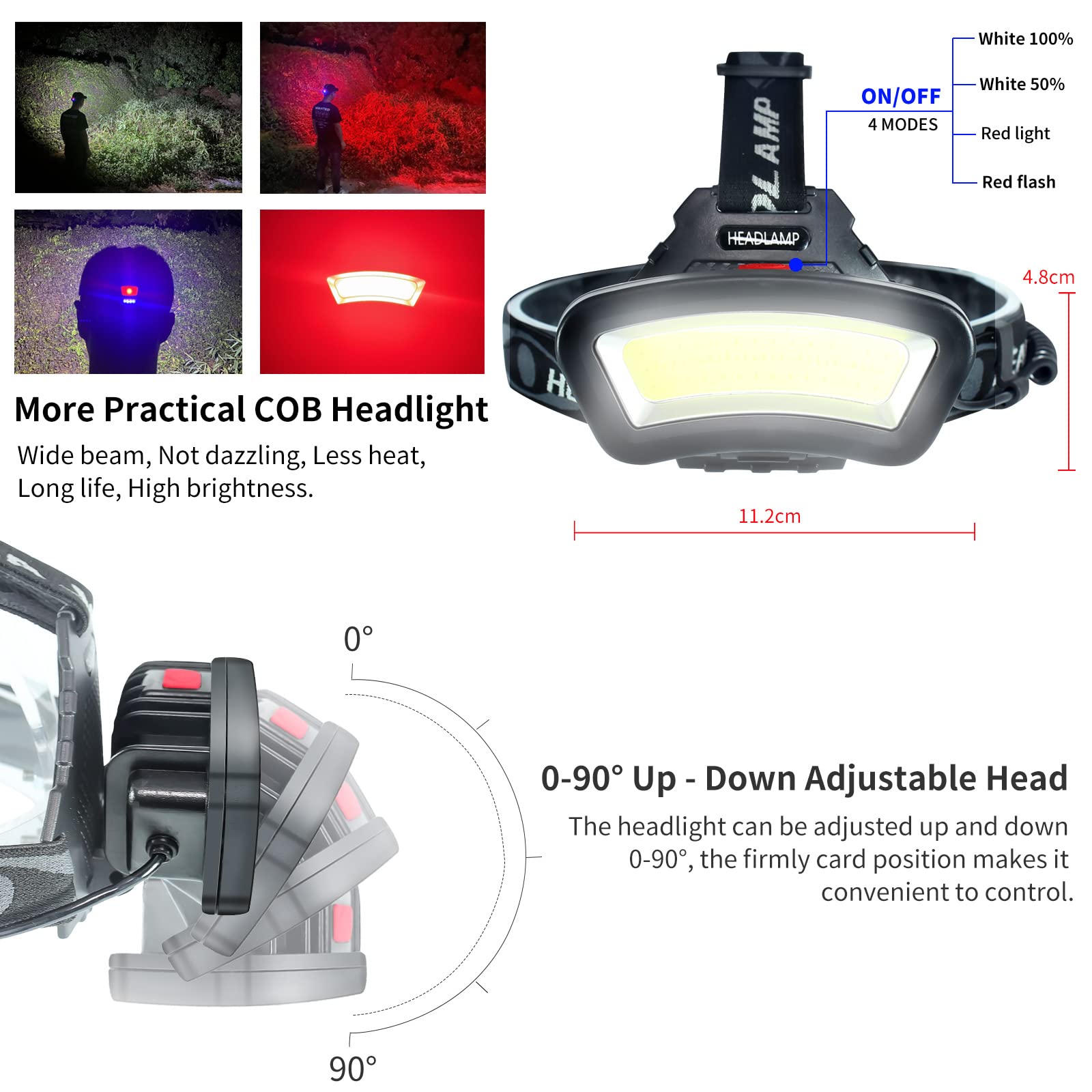 [""]"✔HANDS-FREE, NO HASSLE --- Why waste time and money playing with flashlights and buying extra batteries? With the rechargeable headlamp, you'll have a reliable, hands-free LED headlamp to light up your surroundings, so you can work, read, and explore whenever and wherever you want. You won't run out of uses for this DARKBEAM creation anytime soon! ✔SUPER BRIGHT, SOFT AND NON-WASH LIGHT --- Featuring the curved COB light source, the soft and uniform light won't harm your eyes during illumination. 4 lighting modes: strong white light, weak white light, red light, strobe light. USB rechargeable design --- Equipped with 2 x 3400mAh high-capacity batteries that can be used for over 7 hours in strong lighting conditions and 14 hours in poor lighting conditions. ✔ WATERPROOF FOR OUTDOOR USE --- Reliable, durable, 90º head rotation capacity, turn it to beam in literally any direction you desire! IPX4 resistance grade: outdoor, waterproof and safe to use even in the rain; Inside features high-quality wiring, leak-proof and waterproof to ensure your light stays on even in soaking rain. Don't hesitate to get the new design of projector's bright headlights. ✔ SUITABLE FOR THE WHOLE FAMILY --- Comes with durable elastic headband and hardhat clips (for hardhat, helmet). With a little help from the adjustable headband, you should be able to fit this affordable headlamp on practically any friend, close relative, or acquaintance joining your outdoor (and indoor-!) adventures. → NOTE: Please charge it before use. Floodlight and spotlight cannot be on simultaneously. ← ✔Yes, we mean abundant uses: Use these headlamps to have both hands free while working on a project in the garage, have one ready when the power goes out, or stock up with a whole set to take with you on your family hikes and cave explorations for safety or in emergencies like fires, hurricanes, storms, power outages. Click the "ADD TO CART" button now!"[""]
