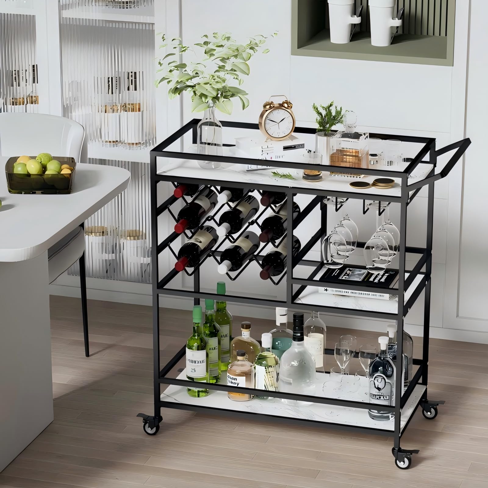DAWNYIELD 3-tier mobile wine cart, bar serving cart on wheels with wine and glass shelves, modern rolling wine storage cart for kitchen home parties (Black)