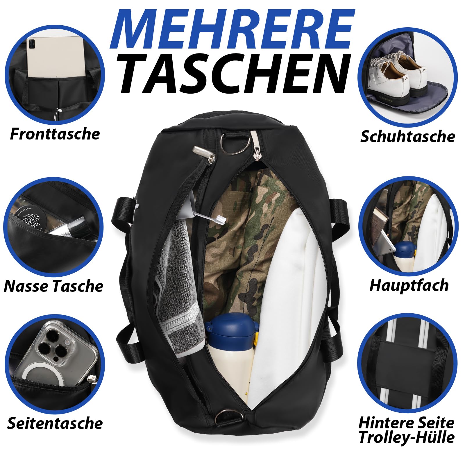 40L large capacity: Gym bags are designed with various pockets. Built-in wet compartment and side shoe compartment where you can store shoes or other items separately from your clothes. Inner main pockets that you can fill with electronic or small personal items or other essentials needed for work or personal travel.