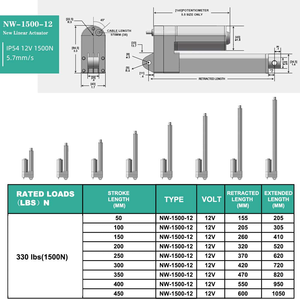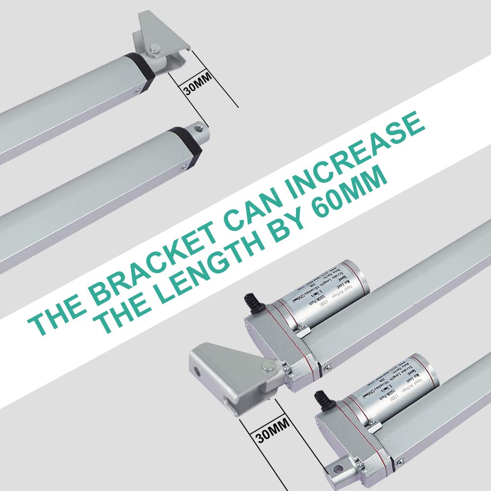 ["Lifting stroke = 2 inches (50 mm); Retracted length = 155 mm, extended length: 205 mm, maximum current draw = 3 Amps, maximum load = 150 kg (330 lbs).","The unit can be controlled with a two-pole switch or with the built-in position sensor and optional programmable linear actuator.","The 12V motor has a gearbox and can hold up to 150 kg at standstill. Full metal casing, waterproof and dustproof for rugged durability.","Quiet, clean and energy-efficient operation. Positions the load precisely at variable and repeatable points throughout the entire stroke.","Package contents: 1 pc 50mm stroke linear actuator & mounting brackets & 1 set Wireless Positive Inversion Controller Kit"]