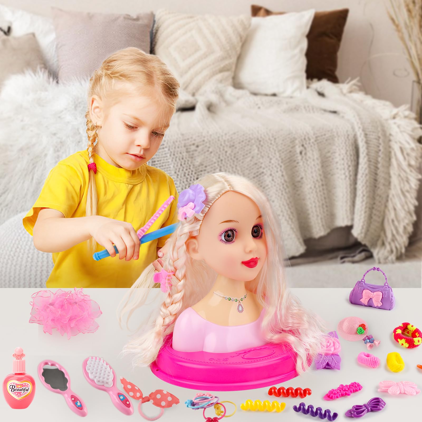["Hair Styling Doll Head Set - The package includes 52 pieces of hairstylist makeup doll accessories: 1 styling head, 2 stickers, 1 makeup case, 1 handbag, 6 hair tools, 23 hairpins, 3 braids, 15 hair ties (The base color of the hair head is random).", "Styling Head Doll Material - Doll head hair styling model made of washable safe and environmentally friendly material. The doll head has thick hair, delicate facial features, and simulated skin, with a smooth appearance and rounded edges, not scratching children's hands.", "Various Hairstyles, DIY Ideas - This makeup and styling head has a cute design and bright colors. Let your child create a variety of different beautiful hairstyles, and also makeup, eyeshadow, lipstick, blush, etc. This set helps cultivate children's practical skills and improve children's creativity and sense of achievement while having fun.", "Little Hairdresser & Makeup Artist - With this doll head with soft and delicate hair and accessories, children can playfully learn hairstyling and makeup. With this hair styling and makeup playset, children can dress up as they please.", "Ideal Gift for Girls - Wonderful holiday or birthday gifts for girls. Hairdresser toys for children are ideal hair and makeup toys for pretend play, allowing girls to imitate makeup and learn to comb hair to create a unique look from their hearts."]