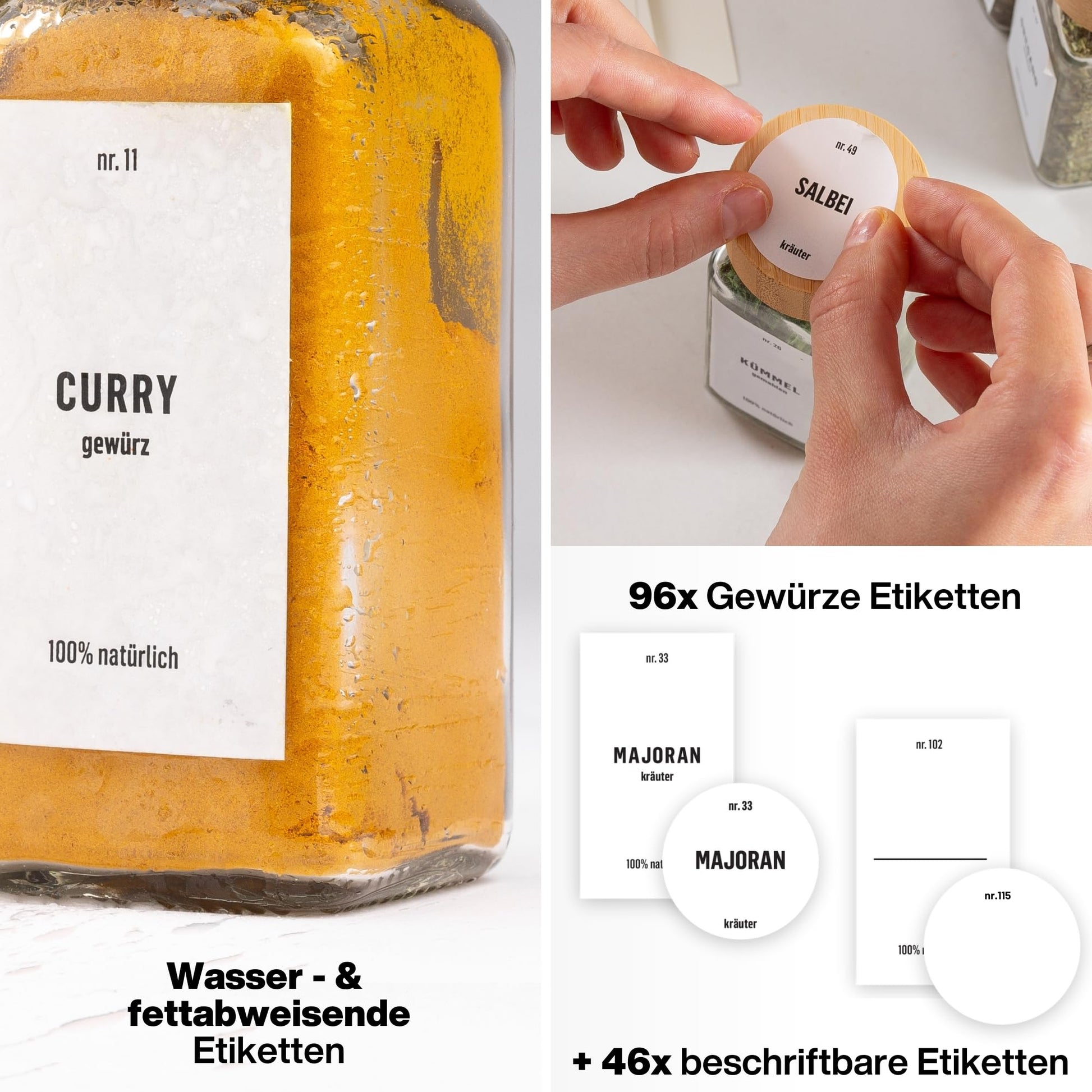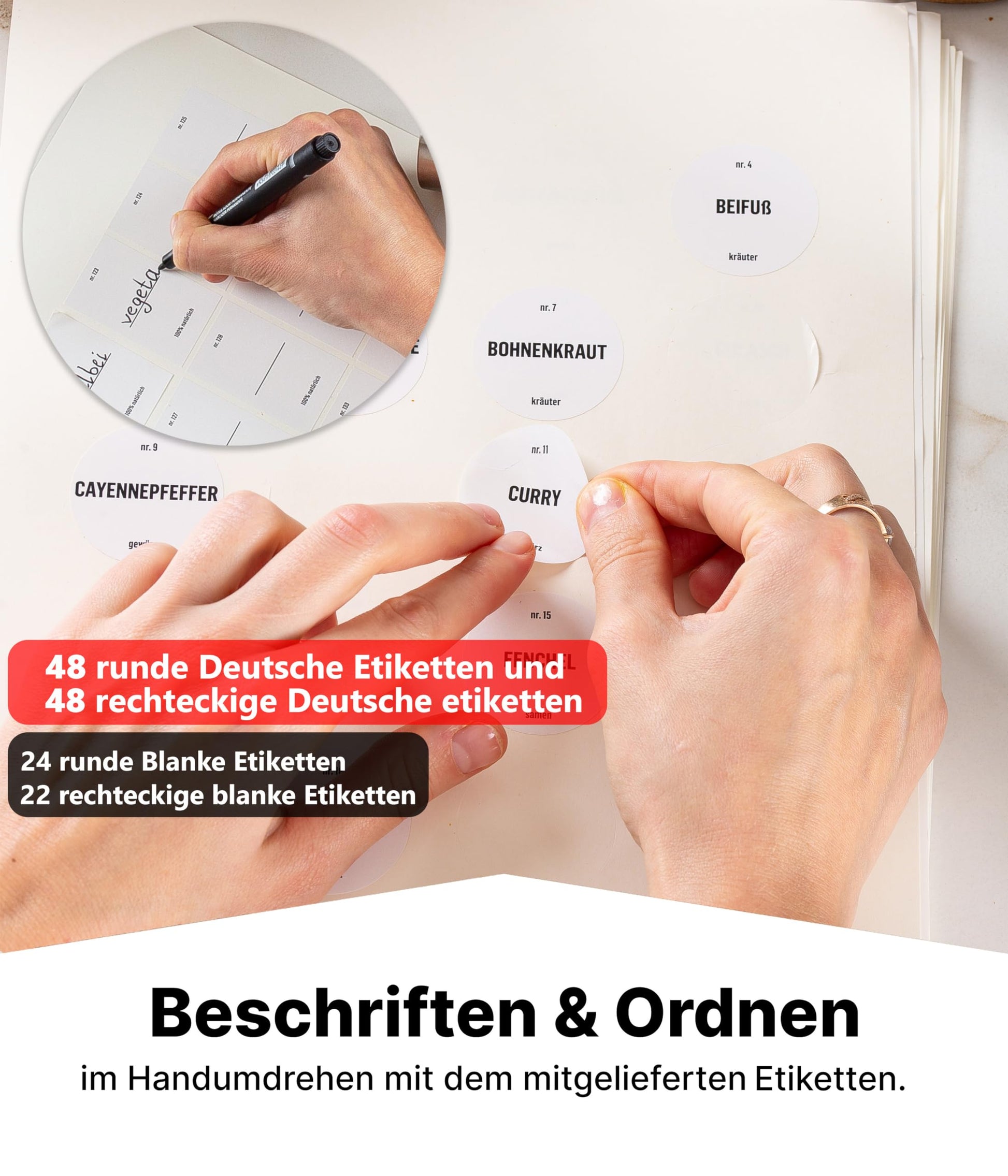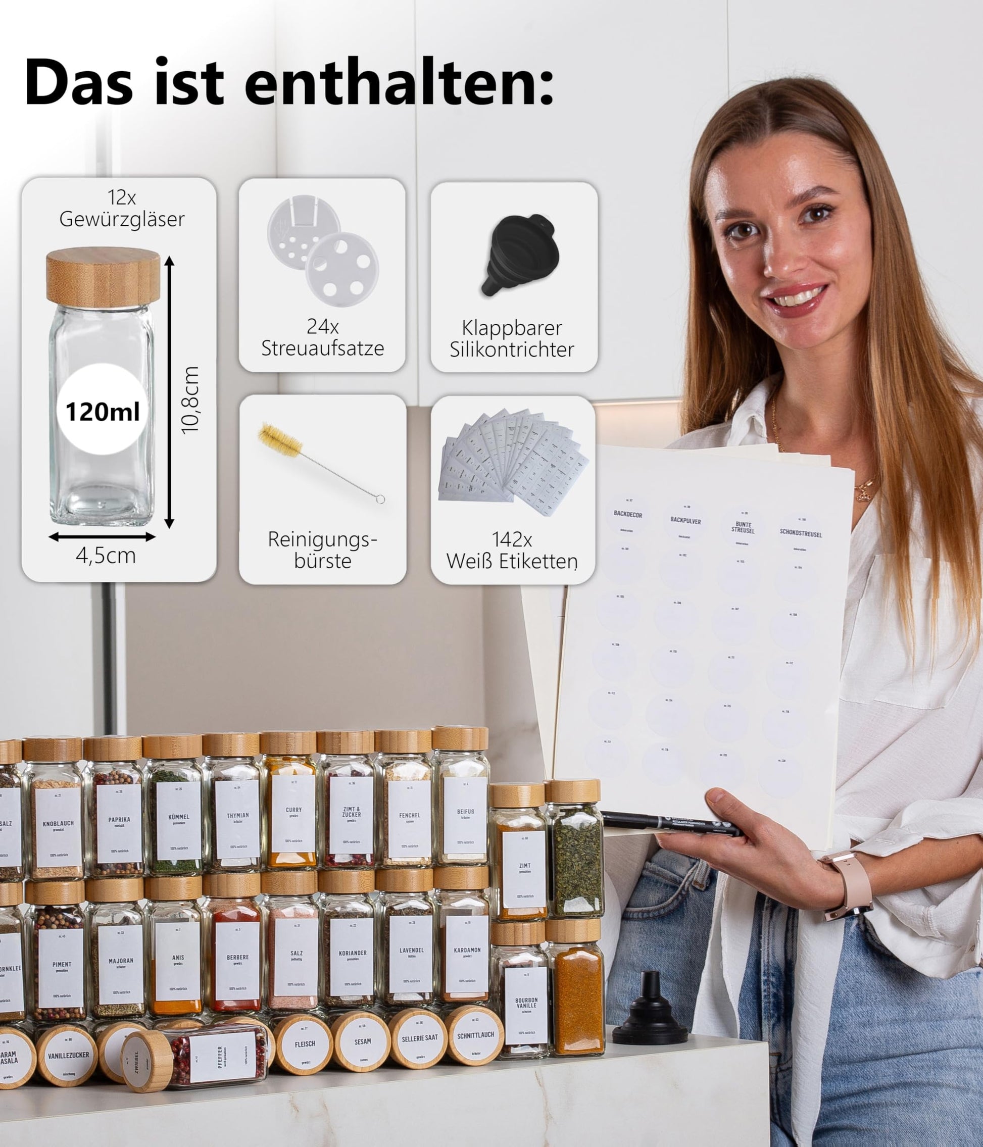 ["FOR MORE ORGANIZATION - From now on, display your spices in our 12 jars uniformly and stylishly. The jars also fit perfectly in our 2-piece spice racks.","FOOD SAFE - Our screw-top jars are made of high-quality glass, making them BPA-free and food-safe, preserving your herbs' flavor.","AIRTIGHT LIDS - The lids are made of durable bamboo and seal the jars airtight, keeping your herbs fresh longer! Includes 2 different shaker tops (12 pieces each).","GREAT ACCESSORIES - You will also receive 96 pre-printed German labels, 46 blank labels, a cleaning brush, and a collapsible silicone funnel.","VERSATILE - You can use this set not only for spices or the kitchen, but also for crafting, decoration, or filled as a small gift."]
