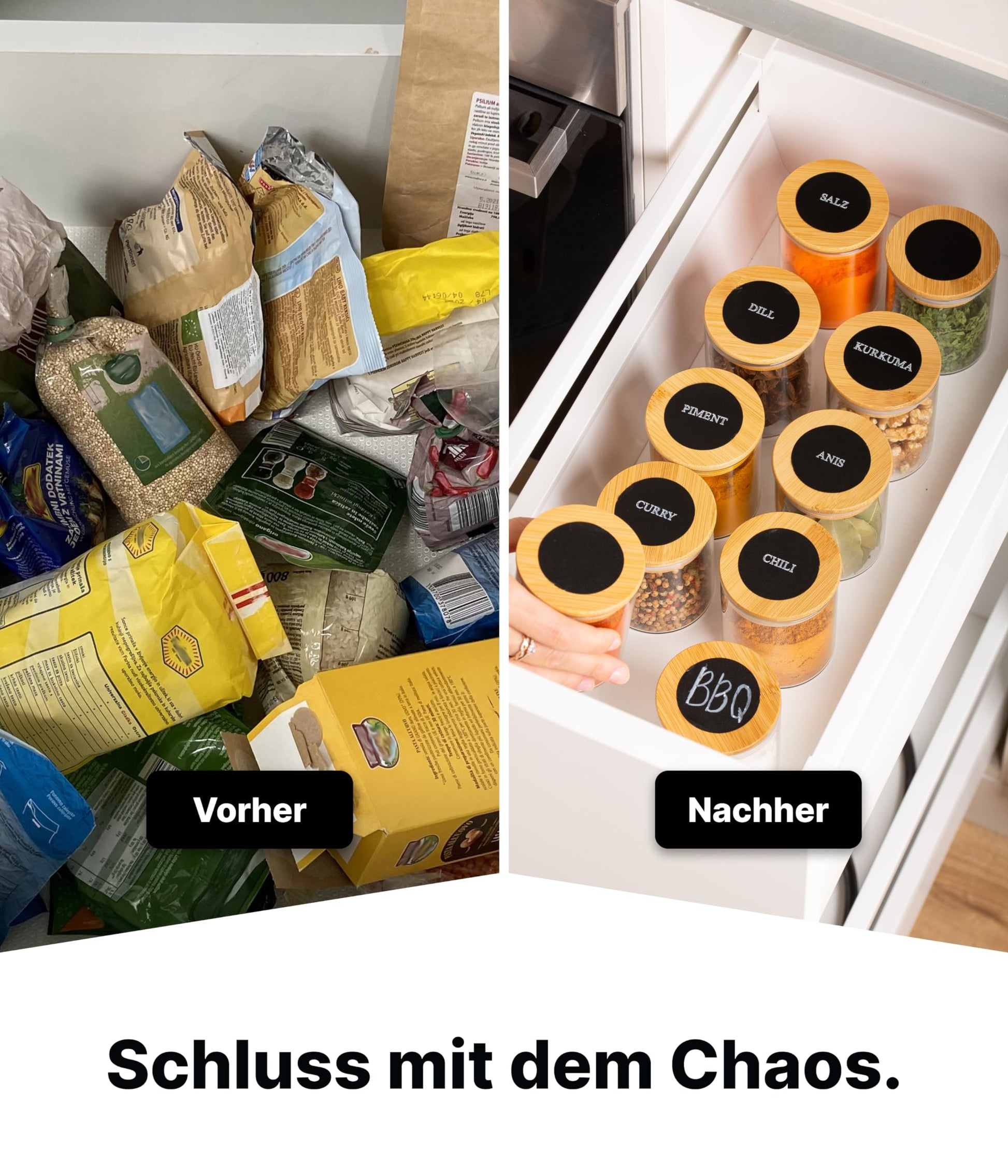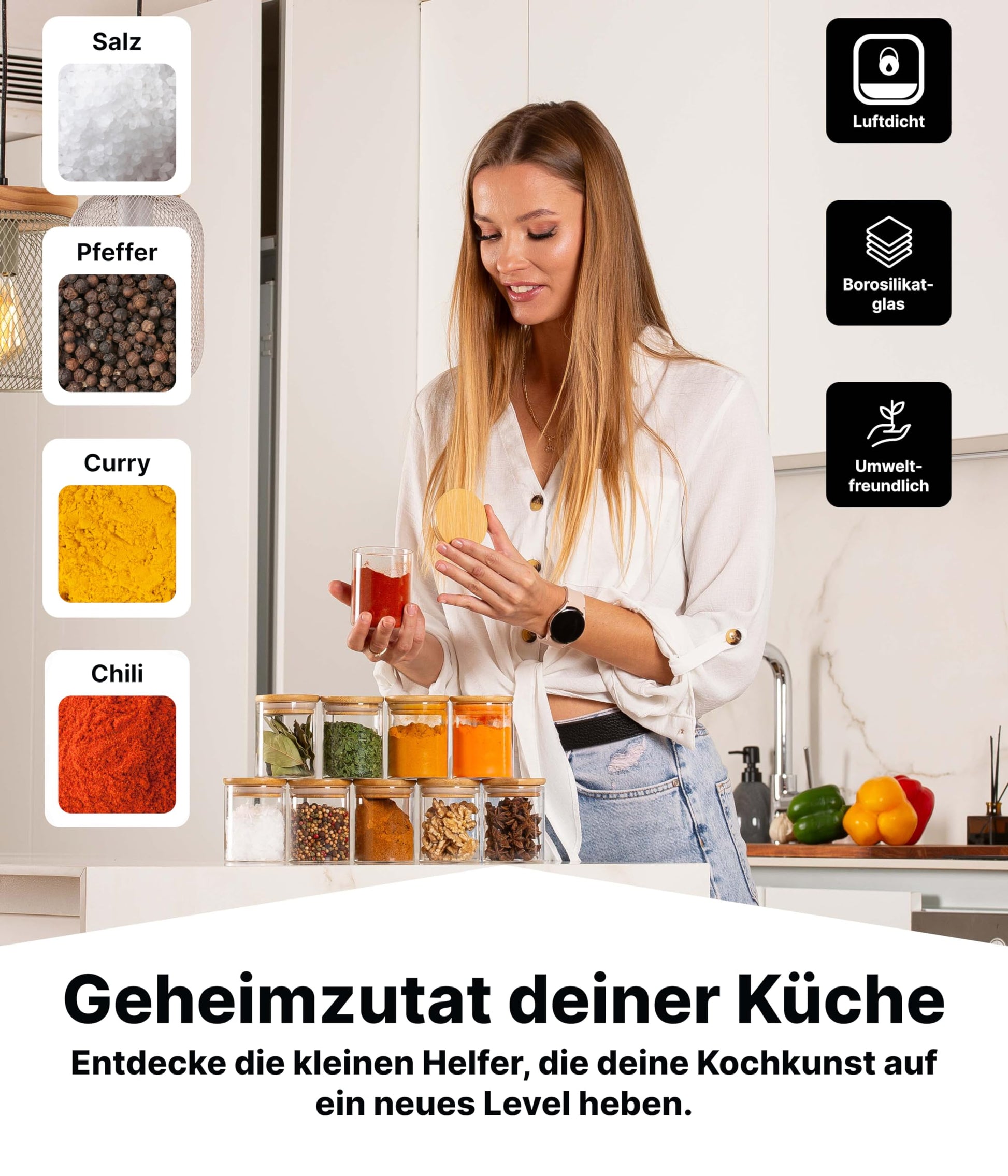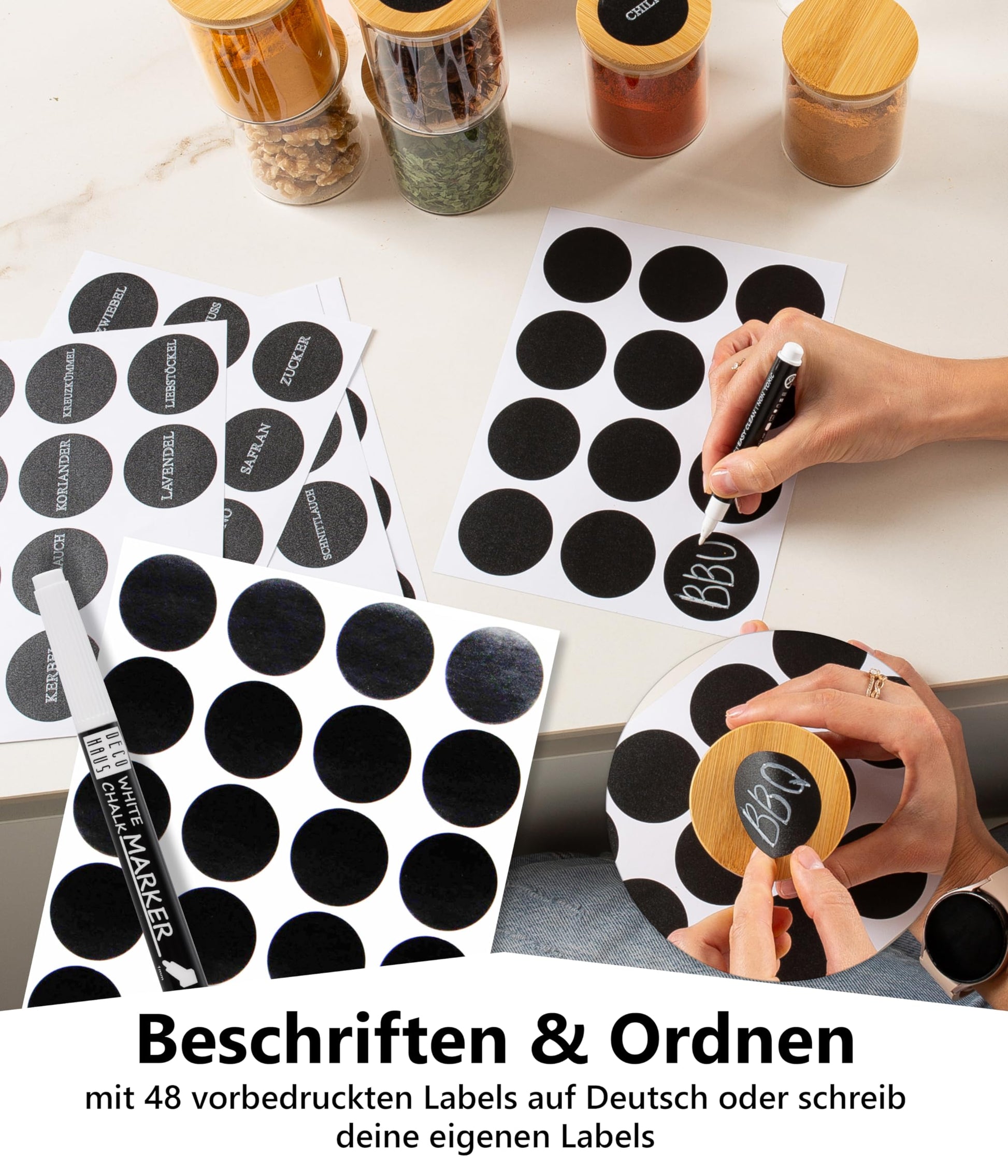 INCLUDES SPICE LABELS - With our spice jars set, you also receive 48 pre-printed labels in German, 12 blank labels, and a chalk pen for labeling the blank labels. This makes storage even easier!"