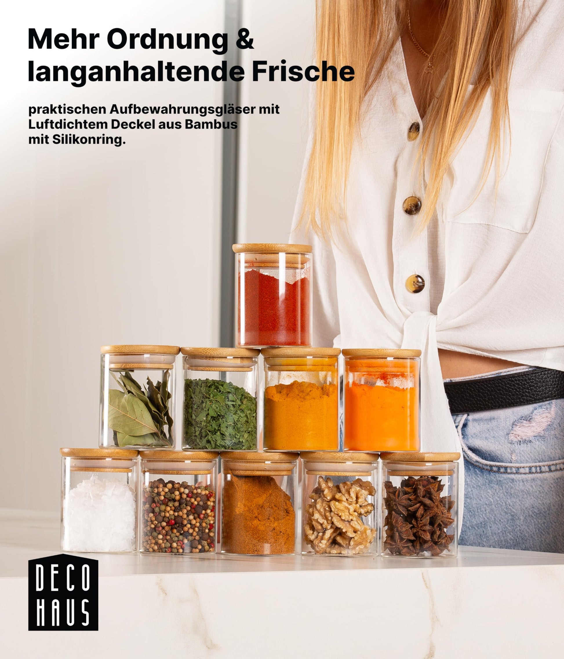 Deco house® Spice Jars Set of 10 with Wooden Lids [+ Labels] - Round Airtight Glass Spice Jars - Spice Containers - Spice Storage Jars Set - Containers for Spices - Spice Storage