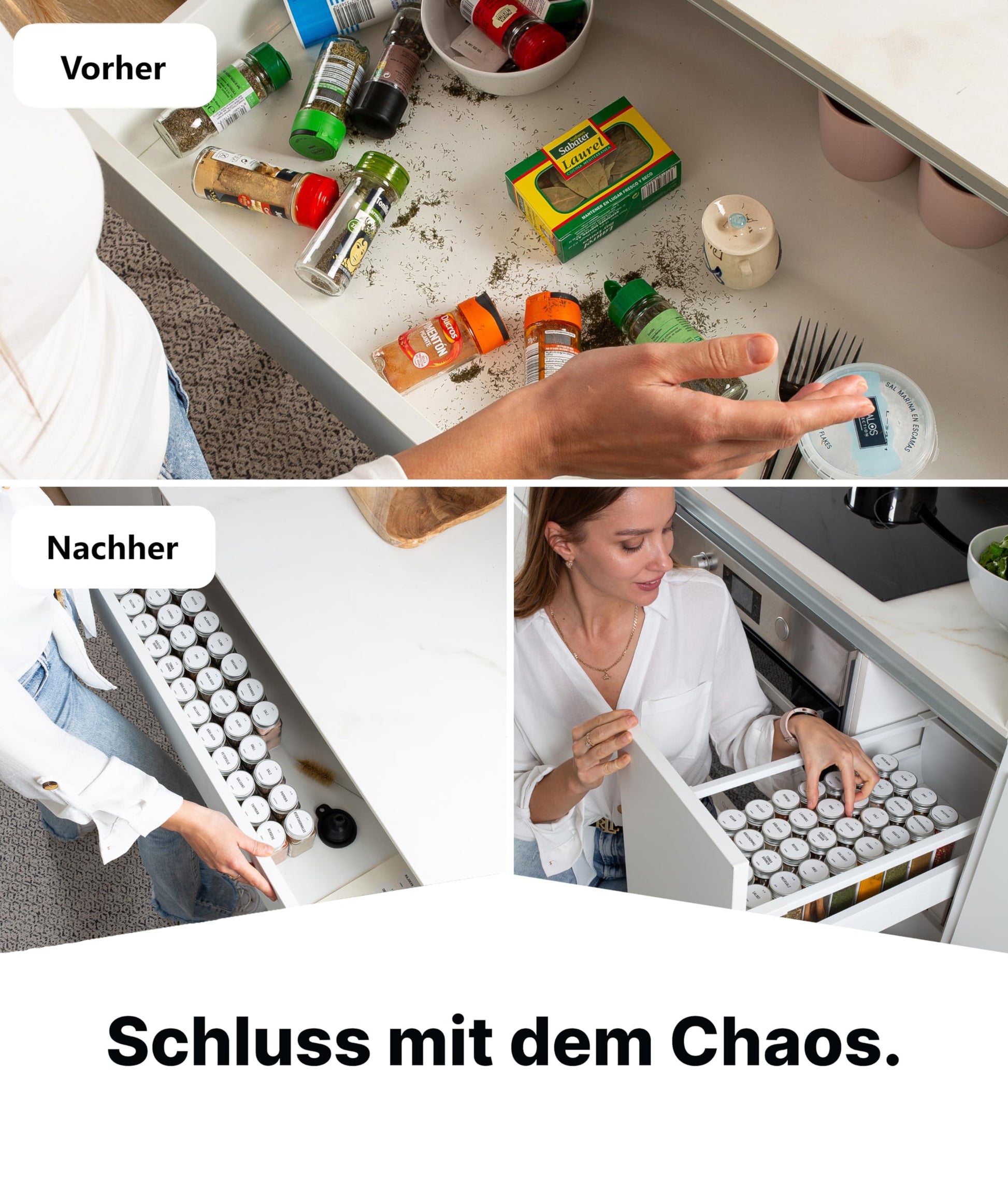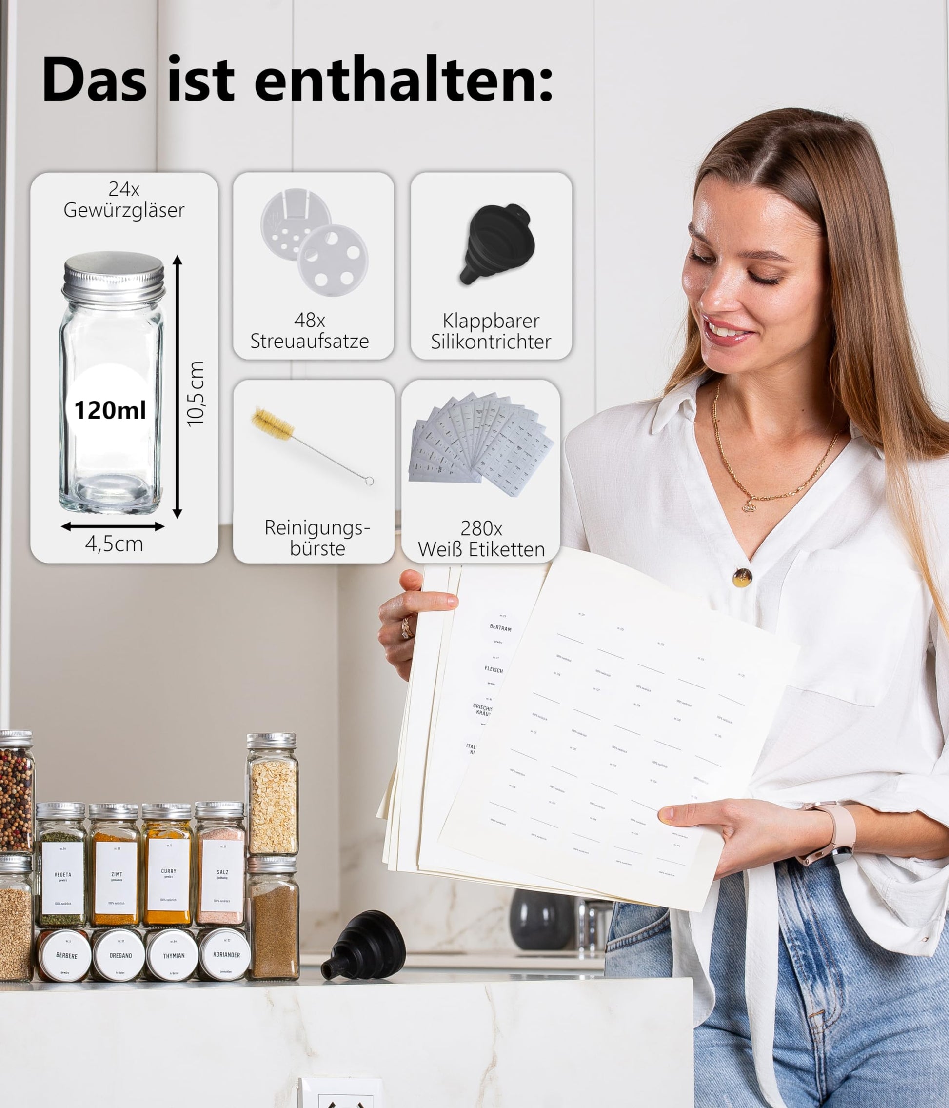 ["FOR MORE ORGANIZATION - From now on, present your spices in our 24 jars uniformly and stylishly. The jars also fit perfectly in our 4-piece spice racks.",