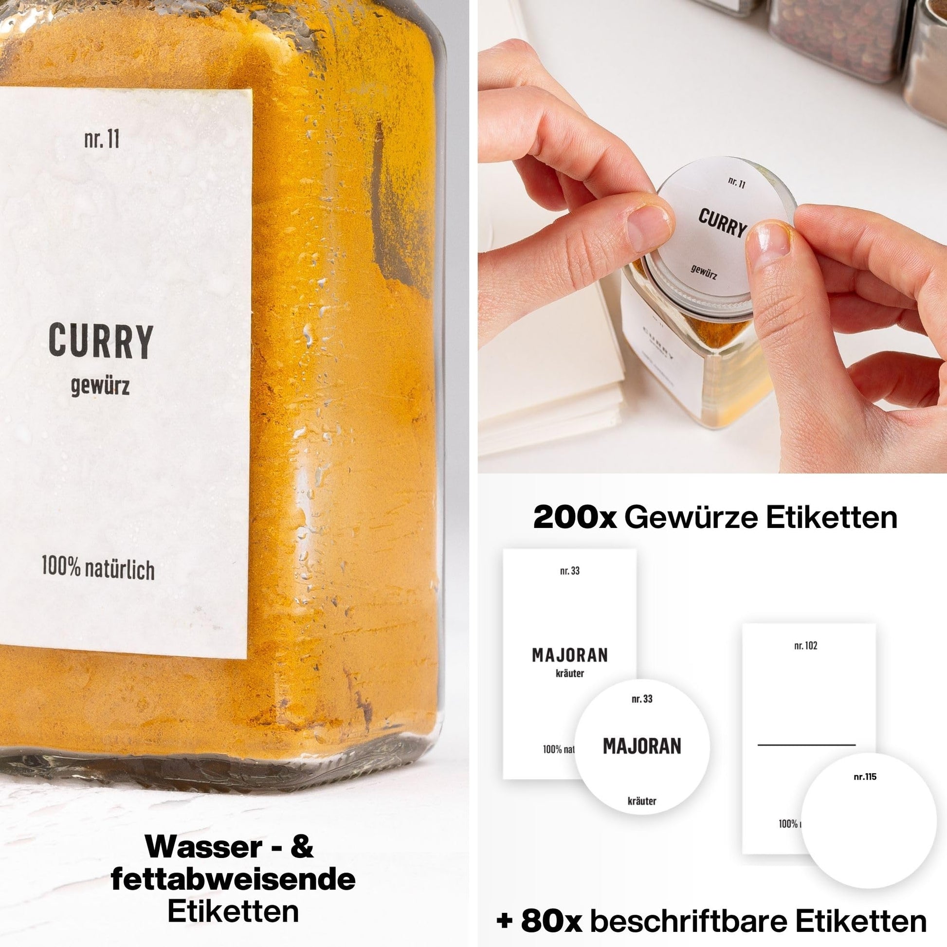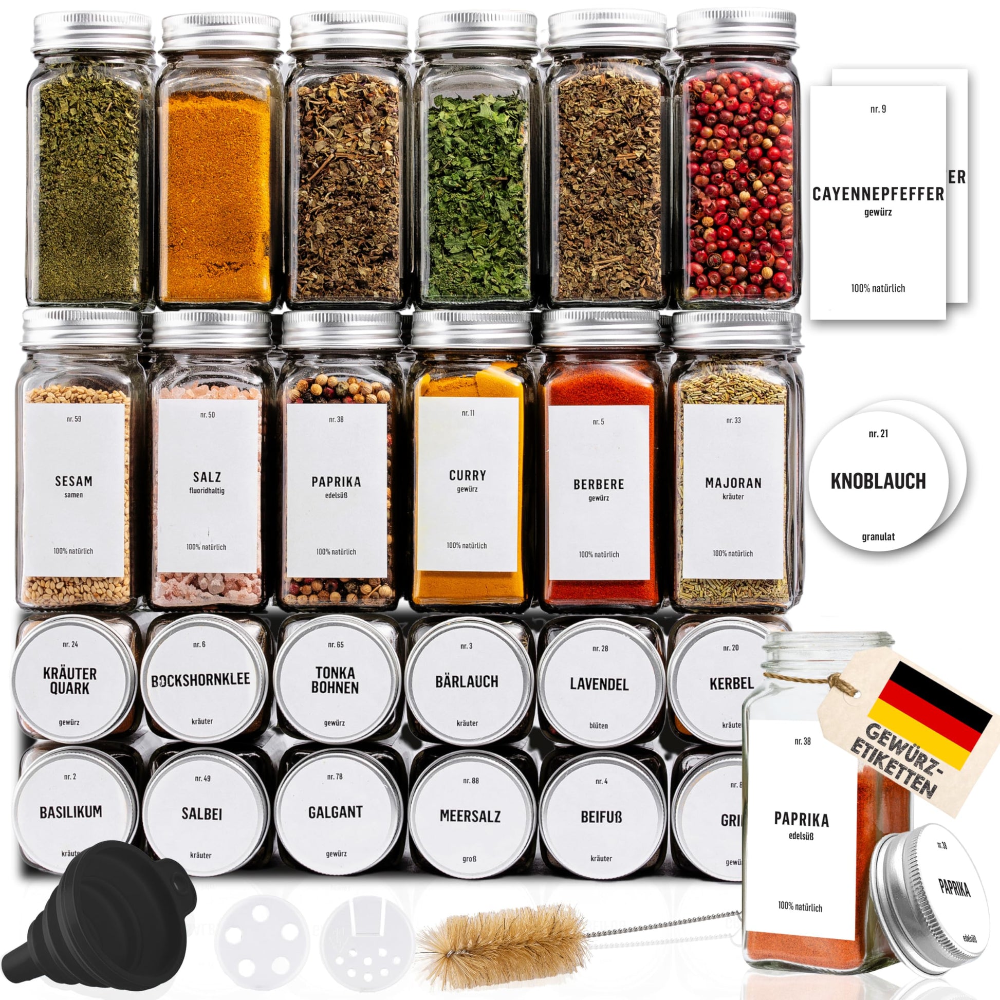 "GREAT ACCESSORIES - In addition, you will receive 200 pre-printed German labels and 80 blank ones that you can label with the chalk pen (not included), as well as a cleaning brush and a collapsible silicone funnel.",