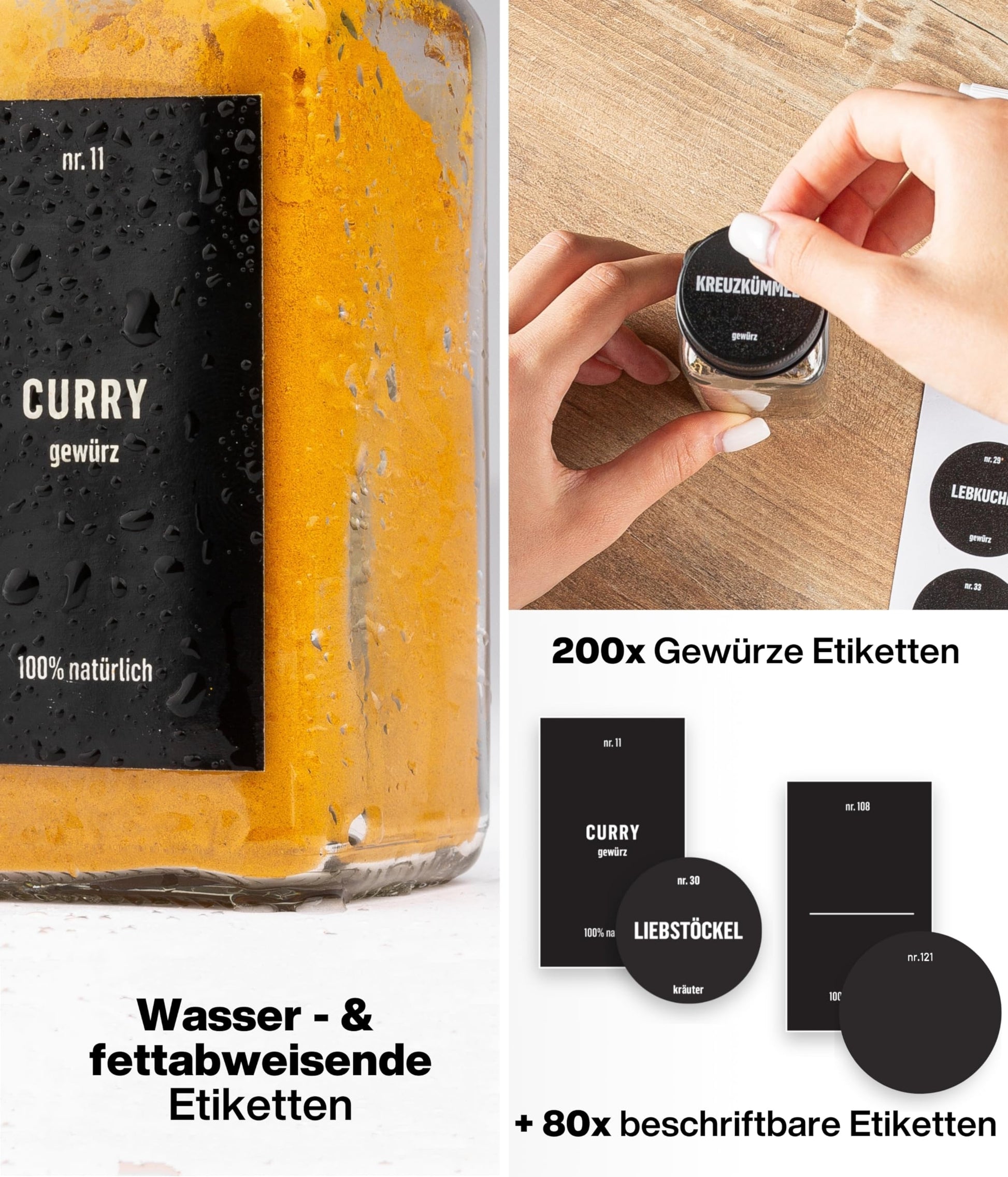 GREAT ACCESSORIES - In addition, you will receive 200 pre-printed German labels and 80 blank ones that you can label with the included chalk pen, as well as a cleaning brush and a collapsible silicone funnel.