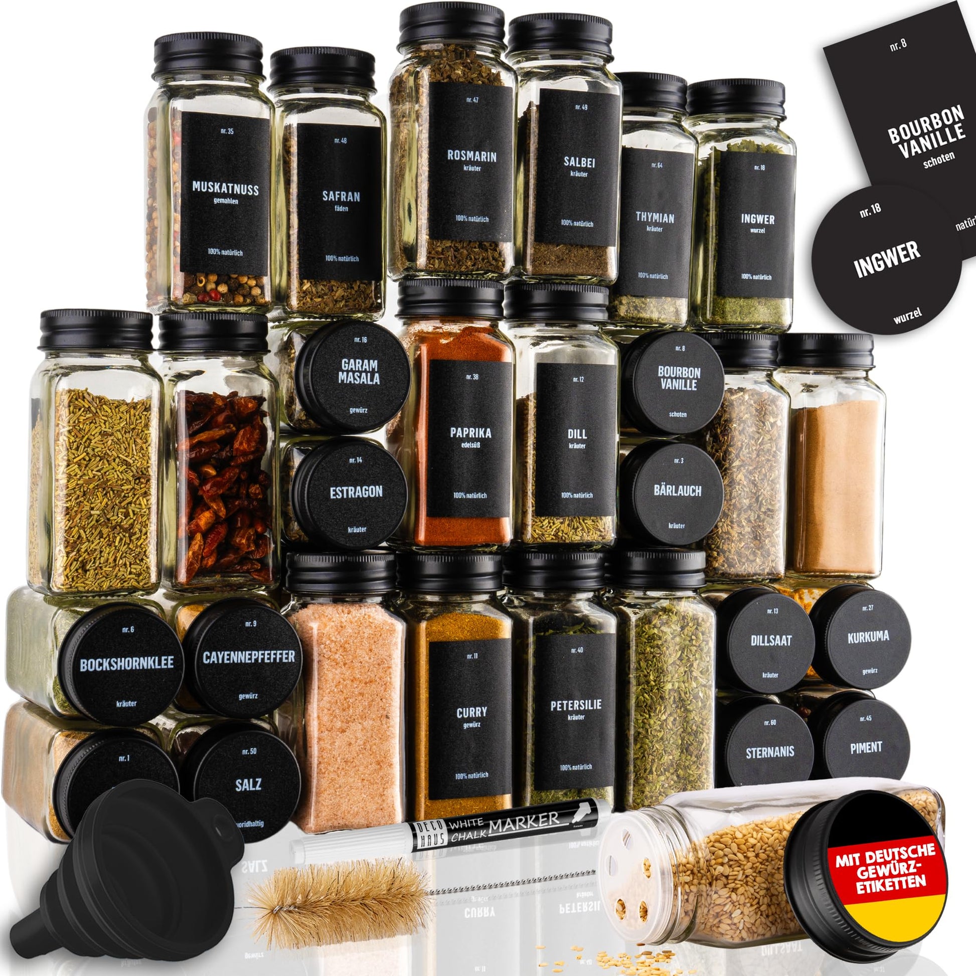 Deco house® Square Spice Jars with Spice Labels, 36-piece set with Shaker Inserts - Spice Jars Set Spice Containers Spice Storage - Spice Jars Spice Shakers Glass