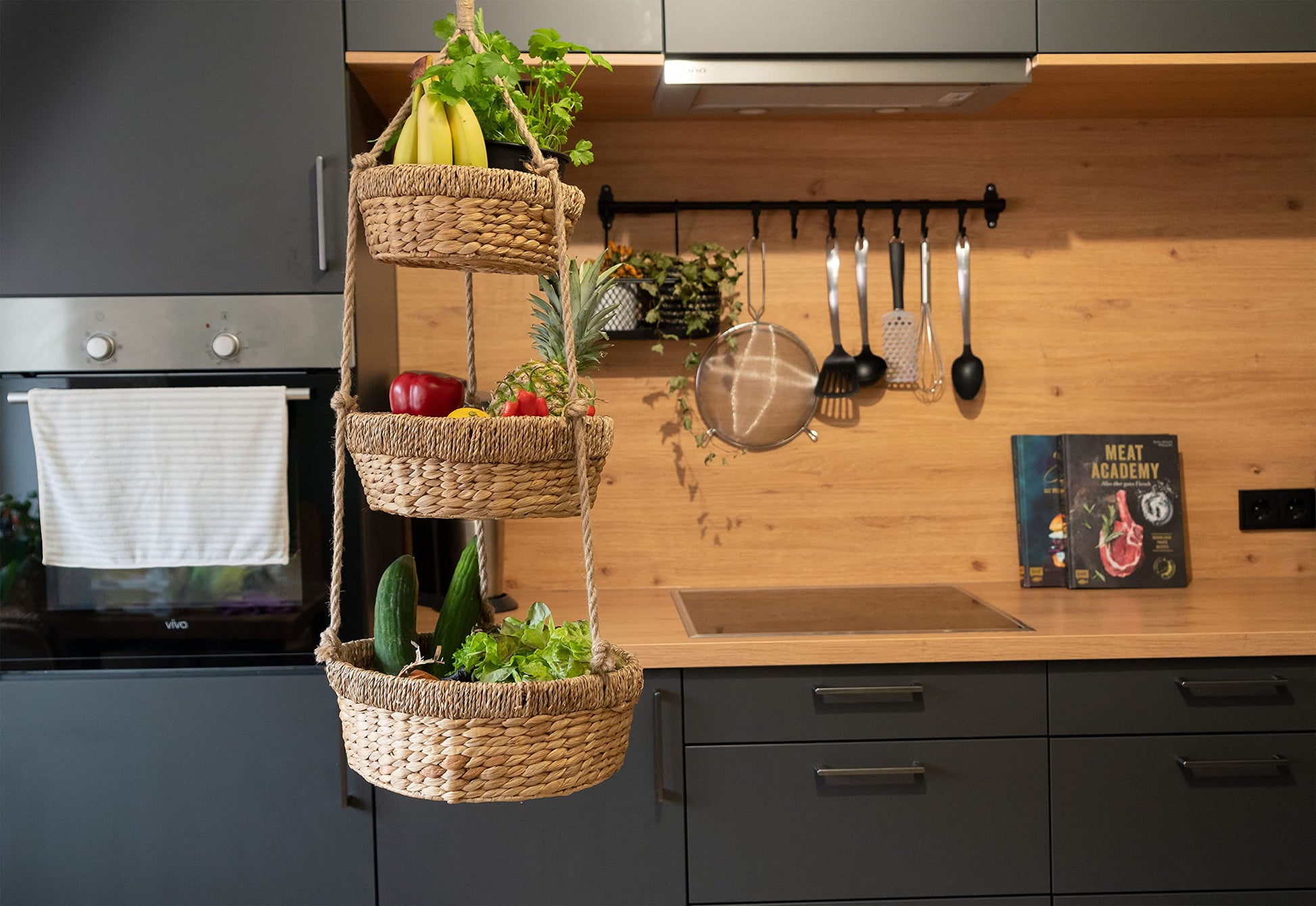 Due to the natural look of straw or rattan, this hanging planter or vegetable planter is perfect for creating a cozy living space feel – Boho style. Hygge! The perfect hanging storage solution for the kitchen.