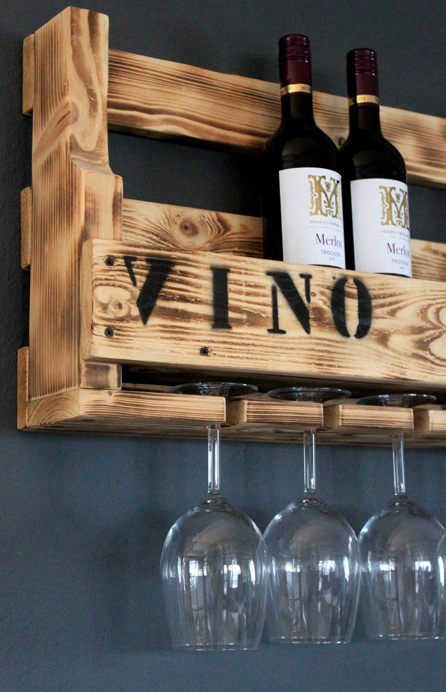 Decorative wooden wine rack for the wall - with glass holder and VINO lettering - Flamed finish - pre-assembled - Shelf for wine bottles and wine glasses